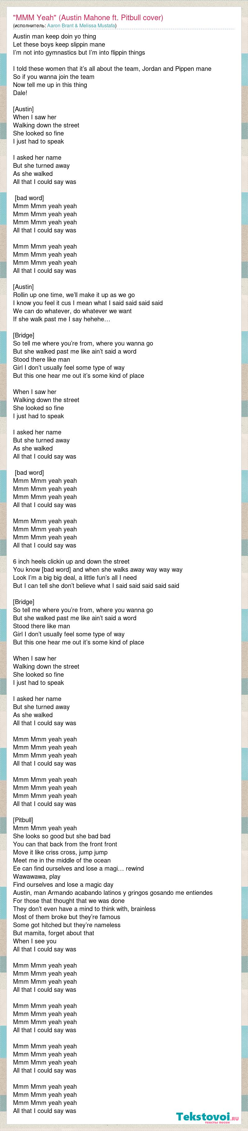 Austin man keep doin yo thing Let these boys keep slippin mane I’m not into gymnastics but I’m into flippin things I told these women that it’s all about the team, Jordan and Pippen mane So if you wanna join the team Now tell me up in this thing Dale! [Austin] When I saw her Walking down the street She looked so fine I just had to speak I asked her name But she turned away As she walked All that I could say was [bad word] Mmm Mmm yeah yeah Mmm Mmm yeah yeah Mmm Mmm yeah yeah All that I could say was Mmm Mmm yeah yeah Mmm Mmm yeah yeah Mmm Mmm yeah yeah All that I could say was [Austin] Rollin up one time, we’ll make it up as we go I know you feel it cus I mean what I said said said said We can do whatever, do whatever we want If she walk past me I say hehehe… [Bridge] So tell me where you’re from, where you wanna go But she walked past me like ain’t said a word Stood there like man Girl I don’t usually feel some type of way But this one hear me out it’s some kind of place When I saw her Walking down the street She looked so fine I just had to speak I asked her name But she turned away As she walked All that I could say was [bad word] Mmm Mmm yeah yeah Mmm Mmm yeah yeah Mmm Mmm yeah yeah All that I could say was Mmm Mmm yeah yeah Mmm Mmm yeah yeah Mmm Mmm yeah yeah All that I could say was 6 inch heels clickin up and down the street You know [bad word] and when she walks away way way way Look I’m a big big deal, a little fun’s all I need But I can tell she don’t believe what I said said said said said [Bridge] So tell me where you’re from, where you wanna go But she walked past me like ain’t said a word Stood there like man Girl I don’t usually feel some type of way But this one hear me out it’s some kind of place When I saw her Walking down the street She looked so fine I just had to speak I asked her name But she turned away As she walked All that I could say was Mmm Mmm yeah yeah Mmm Mmm yeah yeah Mmm Mmm yeah yeah All that I could say was Mmm Mmm yeah yeah Mmm Mmm yeah yeah Mmm Mmm yeah yeah All that I could say was [Pitbull] Mmm Mmm yeah yeah She looks so good but she bad bad You can that back from the front front Move it like criss cross, jump jump Meet me in the middle of the ocean Ee can find ourselves and lose a magi… rewind Wawawawa, play Find ourselves and lose a magic day Austin, man Armando acabando latinos y gringos gosando me entiendes For those that thought that we was done They don’t even have a mind to think with, brainless Most of them broke but they’re famous Some got hitched but they’re nameless But mamita, forget about that When I see you All that I could say was Mmm Mmm yeah yeah Mmm Mmm yeah yeah Mmm Mmm yeah yeah All that I could say was Mmm Mmm yeah yeah Mmm Mmm yeah yeah Mmm Mmm yeah yeah All that I could say was Mmm Mmm yeah yeah Mmm Mmm yeah yeah Mmm Mmm yeah yeah All that I could say was Mmm Mmm yeah yeah Mmm Mmm yeah yeah Mmm Mmm yeah yeah All that I could say was