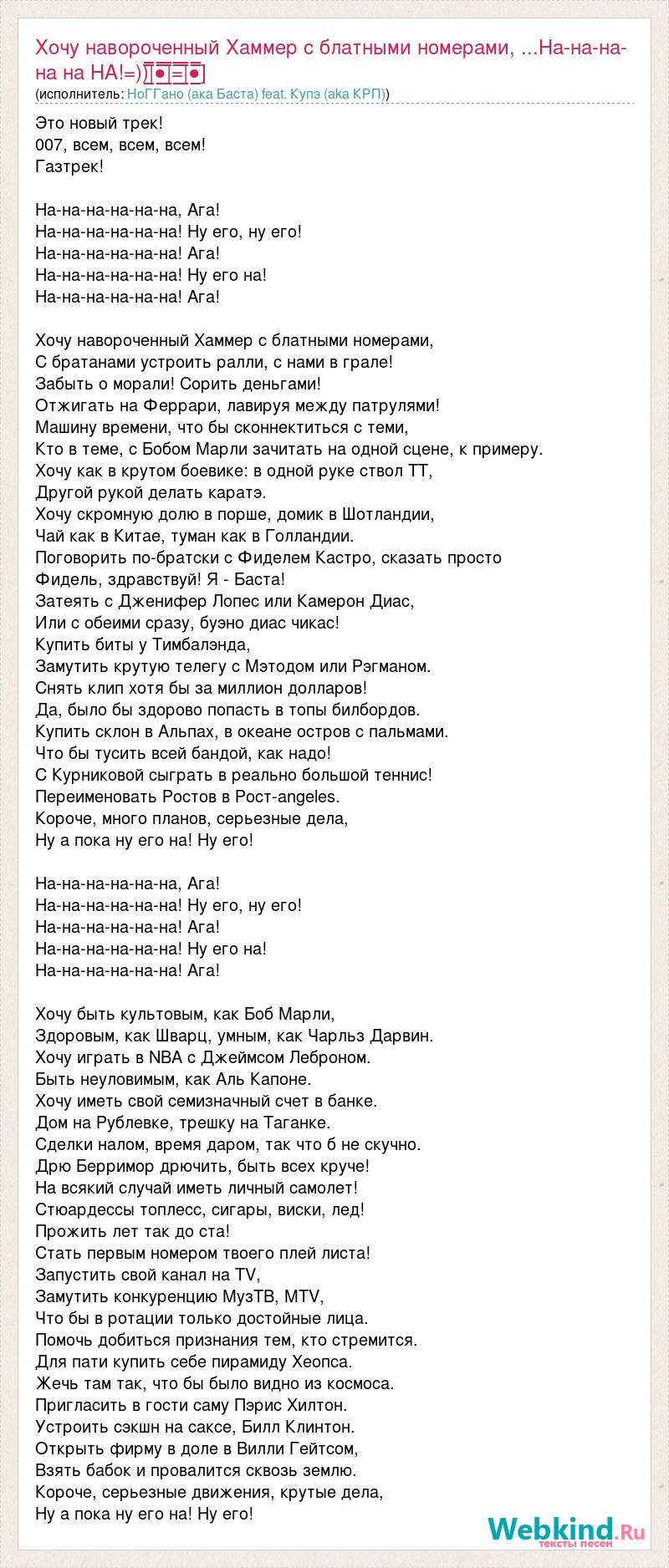 Это новый трек! 007, всем, всем, всем! Газтрек! На-на-на-на-на-на, Ага! На-на-на-на-на-на! Ну его, ну его! На-на-на-на-на-на! Ага! На-на-на-на-на-на! Ну его на! На-на-на-на-на-на! Ага! Хочу навороченный Хаммер с блатными номерами, С братанами устроить ралли, с нами в грале! Забыть о морали! Сорить деньгами! Отжигать на Феррари, лавируя между патрулями! Машину времени, что бы сконнектиться с теми, Кто в теме, с Бобом Марли зачитать на одной сцене, к примеру. Хочу как в крутом боевике: в одной руке ствол ТТ, Другой рукой делать каратэ. Хочу скромную долю в порше, домик в Шотландии, Чай как в Китае, туман как в Голландии. Поговорить по-братски с Фиделем Кастро, сказать просто Фидель, здравствуй! Я - Баста! Затеять с Дженифер Лопес или Камерон Диас, Или с обеими сразу, буэно диас чикас! Купить биты у Тимбалэнда, Замутить крутую телегу с Мэтодом или Рэгманом. Снять клип хотя бы за миллион долларов! Да, было бы здорово попасть в топы билбордов. Купить склон в Альпах, в океане остров с пальмами. Что бы тусить всей бандой, как надо! С Курниковой сыграть в реально большой теннис! Переименовать Ростов в Рост-angeles. Короче, много планов, серьезные дела, Ну а пока ну его на! Ну его! На-на-на-на-на-на, Ага! На-на-на-на-на-на! Ну его, ну его! На-на-на-на-на-на! Ага! На-на-на-на-на-на! Ну его на! На-на-на-на-на-на! Ага! Хочу быть культовым, как Боб Марли, Здоровым, как Шварц, умным, как Чарльз Дарвин. Хочу играть в NBA с Джеймсом Леброном. Быть неуловимым, как Аль Капоне. Хочу иметь свой семизначный счет в банке. Дом на Рублевке, трешку на Таганке. Сделки налом, время даром, так что б не скучно. Дрю Берримор дрючить, быть всех круче! На всякий случай иметь личный самолет! Стюардессы топлесс, сигары, виски, лед! Прожить лет так до ста! Стать первым номером твоего плей листа! Запустить свой канал на TV, Замутить конкуренцию МузТВ, MTV, Что бы в ротации только достойные лица. Помочь добиться признания тем, кто стремится. Для пати купить себе пирамиду Хеопса. Жечь там так, что бы было видно из космоса. Пригласить в гости саму Пэрис Хилтон. Устроить сэкшн на саксе, Билл Клинтон. Открыть фирму в доле в Вилли Гейтсом, Взять бабок и провалится сквозь землю. Короче, серьезные движения, крутые дела, Ну а пока ну его на! Ну его!