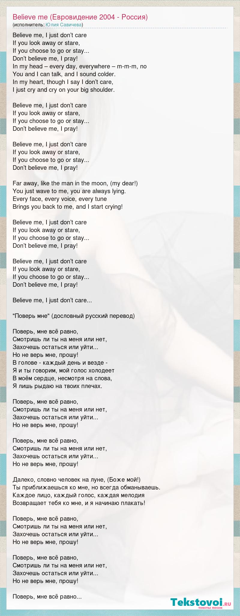 Believe me, I just don’t care If you look away or stare, If you choose to go or stay... Don’t believe me, I pray! In my head – every day, everywhere – m-m-m, no You and I can talk, and I sound colder. In my heart, though I say I don’t care, I just cry and cry on your big shoulder. Believe me, I just don’t care If you look away or stare, If you choose to go or stay... Don’t believe me, I pray! Believe me, I just don’t care If you look away or stare, If you choose to go or stay... Don’t believe me, I pray! Far away, like the man in the moon, (my dear!) You just wave to me, you are always lying. Every face, every voice, every tune Brings you back to me, and I start crying! Believe me, I just don’t care If you look away or stare, If you choose to go or stay... Don’t believe me, I pray! Believe me, I just don’t care If you look away or stare, If you choose to go or stay... Don’t believe me, I pray! Believe me, I just don’t care... "Поверь мне" (дословный русский перевод) Поверь, мне всё равно, Смотришь ли ты на меня или нет, Захочешь остаться или уйти... Но не верь мне, прошу! В голове - каждый день и везде - Я и ты говорим, мой голос холодеет В моём сердце, несмотря на слова, Я лишь рыдаю на твоих плечах. Поверь, мне всё равно, Смотришь ли ты на меня или нет, Захочешь остаться или уйти... Но не верь мне, прошу! Поверь, мне всё равно, Смотришь ли ты на меня или нет, Захочешь остаться или уйти... Но не верь мне, прошу! Далеко, словно человек на луне, (Боже мой!) Ты приближаешься ко мне, но всегда обманываешь. Каждое лицо, каждый голос, каждая мелодия Возвращает тебя ко мне, и я начинаю плакать! Поверь, мне всё равно, Смотришь ли ты на меня или нет, Захочешь остаться или уйти... Но не верь мне, прошу! Поверь, мне всё равно, Смотришь ли ты на меня или нет, Захочешь остаться или уйти... Но не верь мне, прошу! Поверь, мне всё равно...