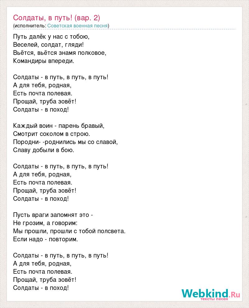 Путь далёк у нас с тобою, Веселей, солдат, гляди! Вьётся, вьётся знамя полковое, Командиры впереди. Солдаты - в путь, в путь, в путь! А для тебя, родная, Есть почта полевая. Прощай, труба зовёт! Солдаты - в поход! Каждый воин - парень бравый, Смотрит соколом в строю. Породни- -роднились мы со славой, Славу добыли в бою. Солдаты - в путь, в путь, в путь! А для тебя, родная, Есть почта полевая. Прощай, труба зовёт! Солдаты - в поход! Пусть враги запомнят это - Не грозим, а говорим: Мы прошли, прошли с тобой полсвета. Если надо - повторим. Солдаты - в путь, в путь, в путь! А для тебя, родная, Есть почта полевая. Прощай, труба зовёт! Солдаты - в поход!