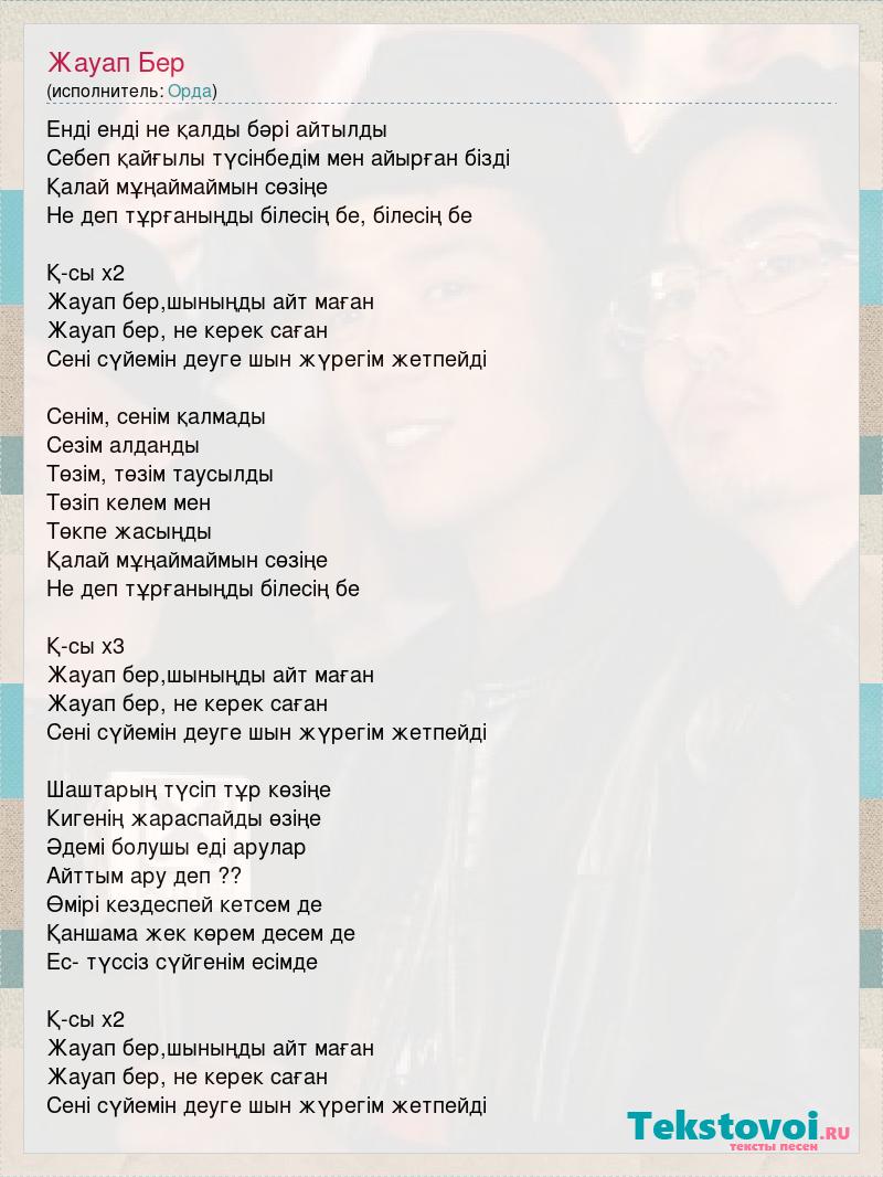 Енді енді не қалды бәрі айтылды Себеп қайғылы түсінбедім мен айырған бізді Қалай мұңаймаймын сөзіңе Не деп тұрғаныңды білесің бе, білесің бе Қ-сы х2 Жауап бер,шыныңды айт маған Жауап бер, не керек саған Сені сүйемін деуге шын жүрегім жетпейді Сенім, сенім қалмады Сезім алданды Төзім, төзім таусылды Төзіп келем мен Төкпе жасыңды Қалай мұңаймаймын сөзіңе Не деп тұрғаныңды білесің бе Қ-сы х3 Жауап бер,шыныңды айт маған Жауап бер, не керек саған Сені сүйемін деуге шын жүрегім жетпейді Шаштарың түсіп тұр көзіңе Кигенің жараспайды өзіңе Әдемі болушы еді арулар Айттым ару деп ?? Өмірі кездеспей кетсем де Қаншама жек көрем десем де Ес- түссіз сүйгенім есімде Қ-сы х2 Жауап бер,шыныңды айт маған Жауап бер, не керек саған Сені сүйемін деуге шын жүрегім жетпейді
