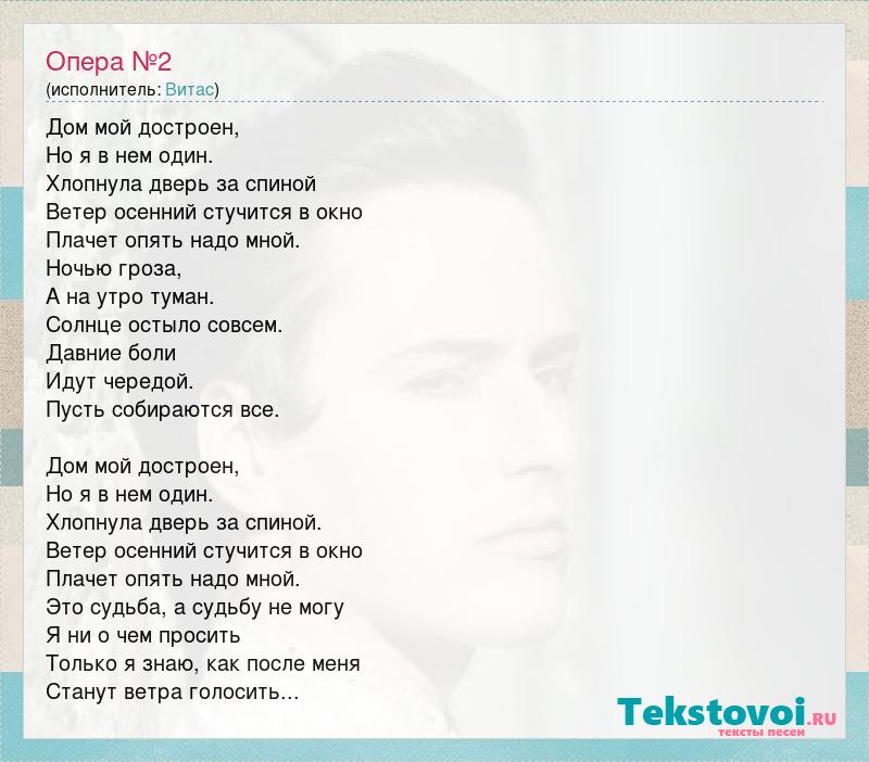 Дом мой достроен, Но я в нем один. Хлопнула дверь за спиной Ветер осенний стучится в окно Плачет опять надо мной. Ночью гроза, А на утро туман. Солнце остыло совсем. Давние боли Идут чередой. Пусть собираются все. Дом мой достроен, Но я в нем один. Хлопнула дверь за спиной. Ветер осенний стучится в окно Плачет опять надо мной. Это судьба, а судьбу не могу Я ни о чем просить Только я знаю, как после меня Станут ветра голосить...