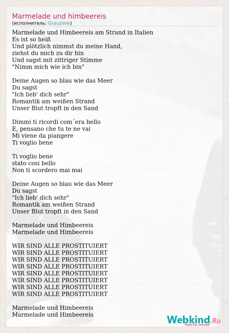 Marmelade und Himbeereis am Strand in Italien Es ist so heiß Und plötzlich nimmst du meine Hand, ziehst du mich zu dir hin Und sagst mit zittriger Stimme "Nimm mich wie ich bin" Deine Augen so blau wie das Meer Du sagst "Ich lieb' dich sehr" Romantik am weißen Strand Unser Blut tropft in den Sand Dimmi ti ricordi com´era bello E, pensano che tu te ne vai Mi viene da piangere Ti voglio bene Ti voglio bene stato cosi bello Non ti scordero mai mai Deine Augen so blau wie das Meer Du sagst "Ich lieb' dich sehr" Romantik am weißen Strand Unser Blut tropft in den Sand Marmelade und Himbeereis Marmelade und Himbeereis WIR SIND ALLE PROSTITUIERT WIR SIND ALLE PROSTITUIERT WIR SIND ALLE PROSTITUIERT WIR SIND ALLE PROSTITUIERT WIR SIND ALLE PROSTITUIERT WIR SIND ALLE PROSTITUIERT WIR SIND ALLE PROSTITUIERT WIR SIND ALLE PROSTITUIERT Marmelade und Himbeereis Marmelade und Himbeereis