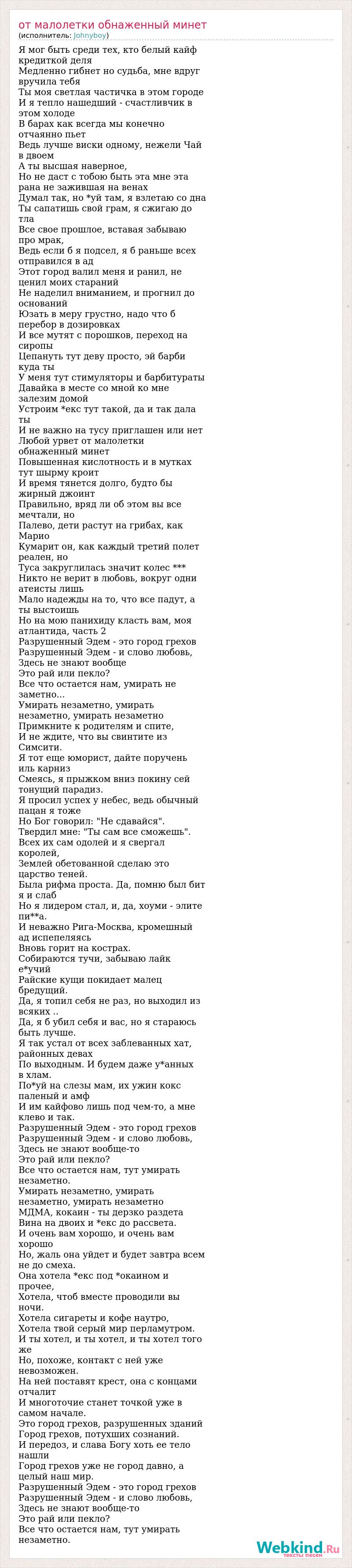 Я мог быть среди тех, кто белый кайф кредиткой деля Медленно гибнет но судьба, мне вдруг вручила тебя Ты моя светлая частичка в этом городе И я тепло нашедший - счастливчик в этом холоде В барах как всегда мы конечно отчаянно пьет Ведь лучше виски одному, нежели Чай в двоем А ты высшая наверное, Но не даст с тобою быть эта мне эта рана не зажившая на венах Думал так, но *уй там, я взлетаю со дна Ты сапатишь свой грам, я сжигаю до тла Все свое прошлое, вставая забываю про мрак, Ведь если б я подсел, я б раньше всех отправился в ад Этот город валил меня и ранил, не ценил моих стараний Не наделил вниманием, и прогнил до оснований Юзать в меру грустно, надо что б перебор в дозировках И все мутят с порошков, переход на сиропы Цепануть тут деву просто, эй барби куда ты У меня тут стимуляторы и барбитураты Давайка в месте со мной ко мне залезим домой Устроим *екс тут такой, да и так дала ты И не важно на тусу приглашен или нет Любой урвет от малолетки обнаженный минет Повышенная кислотность и в мутках тут шырму кроит И время тянется долго, будто бы жирный джоинт Правильно, вряд ли об этом вы все мечтали, но Палево, дети растут на грибах, как Марио Кумарит он, как каждый третий полет реален, но Туса закруглилась значит колес *** Никто не верит в любовь, вокруг одни атеисты лишь Мало надежды на то, что все падут, а ты выстоишь Но на мою панихиду класть вам, моя атлантида, часть 2 Разрушенный Эдем - это город грехов Разрушенный Эдем - и слово любовь, Здесь не знают вообще Это рай или пекло? Все что остается нам, умирать не заметно... Умирать незаметно, умирать незаметно, умирать незаметно Примкните к родителям и спите, И не ждите, что вы свинтите из Симсити. Я тот еще юморист, дайте поручень иль карниз Смеясь, я прыжком вниз покину сей тонущий парадиз. Я просил успех у небес, ведь обычный пацан я тоже Но Бог говорил: "Не сдавайся". Твердил мне: "Ты сам все сможешь". Всех их сам одолей и я свергал королей, Землей обетованной сделаю это царство теней. Была рифма проста. Да, помню был бит я и слаб Но я лидером стал, и, да, хоуми - элите пи**а. И неважно Рига-Москва, кромешный ад испепеляясь Вновь горит на кострах. Собираются тучи, забываю лайк е*учий Райские кущи покидает малец бредущий. Да, я топил себя не раз, но выходил из всяких .. Да, я б убил себя и вас, но я стараюсь быть лучше. Я так устал от всех заблеванных хат, районных девах По выходным. И будем даже у*анных в хлам. По*уй на слезы мам, их ужин кокс паленый и амф И им кайфово лишь под чем-то, а мне клево и так. Разрушенный Эдем - это город грехов Разрушенный Эдем - и слово любовь, Здесь не знают вообще-то Это рай или пекло? Все что остается нам, тут умирать незаметно. Умирать незаметно, умирать незаметно, умирать незаметно МДМА, кокаин - ты дерзко раздета Вина на двоих и *екс до рассвета. И очень вам хорошо, и очень вам хорошо Но, жаль она уйдет и будет завтра всем не до смеха. Она хотела *екс под *окаином и прочее, Хотела, чтоб вместе проводили вы ночи. Хотела сигареты и кофе наутро, Хотела твой серый мир перламутром. И ты хотел, и ты хотел, и ты хотел того же Но, похоже, контакт с ней уже невозможен. На ней поставят крест, она с концами отчалит И многоточие станет точкой уже в самом начале. Это город грехов, разрушенных зданий Город грехов, потухших сознаний. И передоз, и слава Богу хоть ее тело нашли Город грехов уже не город давно, а целый наш мир. Разруш