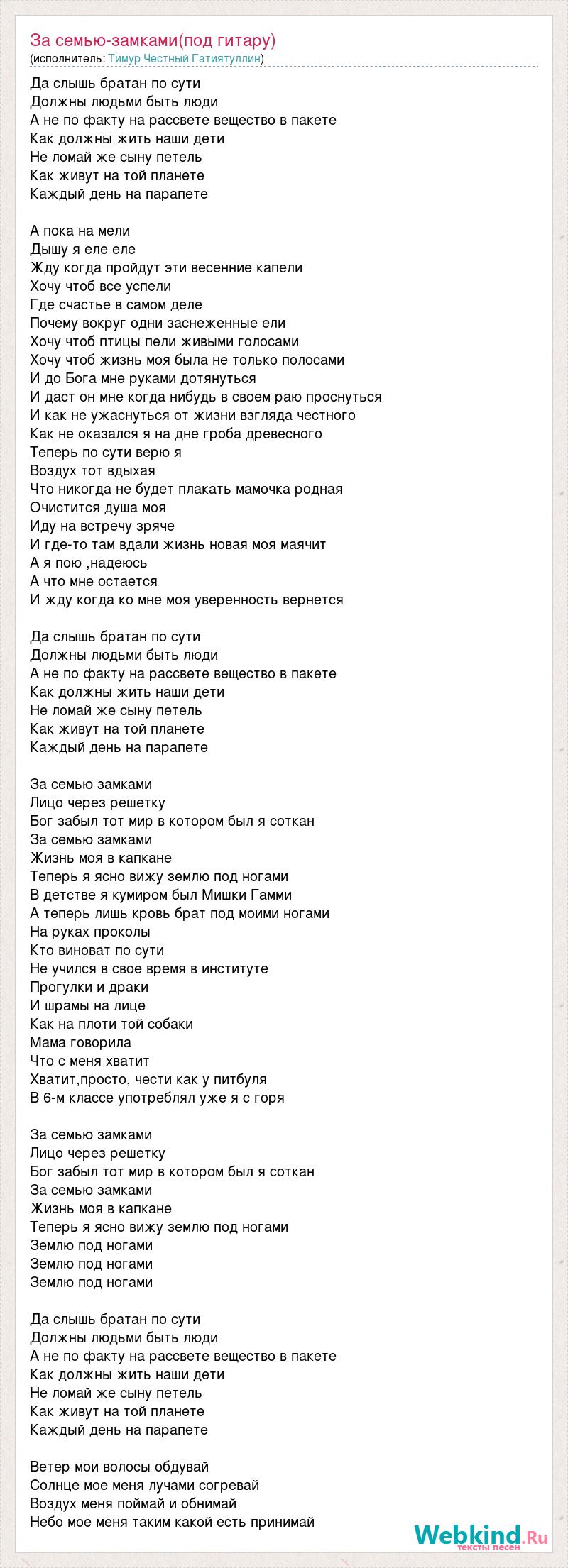 Да слышь братан по сути Должны людьми быть люди А не по факту на рассвете вещество в пакете Как должны жить наши дети Не ломай же сыну петель Как живут на той планете Каждый день на парапете А пока на мели Дышу я еле еле Жду когда пройдут эти весенние капели Хочу чтоб все успели Где счастье в самом деле Почему вокруг одни заснеженные ели Хочу чтоб птицы пели живыми голосами Хочу чтоб жизнь моя была не только полосами И до Бога мне руками дотянуться И даст он мне когда нибудь в своем раю проснуться И как не ужаснуться от жизни взгляда честного Как не оказался я на дне гроба древесного Теперь по сути верю я Воздух тот вдыхая Что никогда не будет плакать мамочка родная Очистится душа моя Иду на встречу зряче И где-то там вдали жизнь новая моя маячит А я пою ,надеюсь А что мне остается И жду когда ко мне моя уверенность вернется Да слышь братан по сути Должны людьми быть люди А не по факту на рассвете вещество в пакете Как должны жить наши дети Не ломай же сыну петель Как живут на той планете Каждый день на парапете За семью замками Лицо через решетку Бог забыл тот мир в котором был я соткан За семью замками Жизнь моя в капкане Теперь я ясно вижу землю под ногами В детстве я кумиром был Мишки Гамми А теперь лишь кровь брат под моими ногами На руках проколы Кто виноват по сути Не учился в свое время в институте Прогулки и драки И шрамы на лице Как на плоти той собаки Мама говорила Что с меня хватит Хватит,просто, чести как у питбуля В 6-м классе употреблял уже я с горя За семью замками Лицо через решетку Бог забыл тот мир в котором был я соткан За семью замками Жизнь моя в капкане Теперь я ясно вижу землю под ногами Землю под ногами Землю под ногами Землю под ногами Да слышь братан по сути Должны людьми быть люди А не по факту на рассвете вещество в пакете Как должны жить наши дети Не ломай же сыну петель Как живут на той планете Каждый день на парапете Ветер мои волосы обдувай Солнце мое меня лучами согревай Воздух меня поймай и обнимай Небо мое меня таким какой есть принимай
