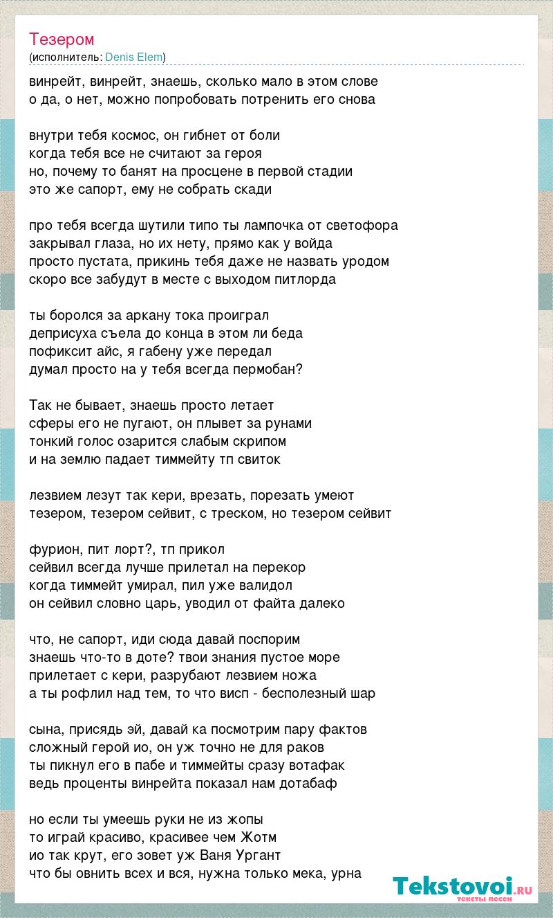 винрейт, винрейт, знаешь, сколько мало в этом слове о да, о нет, можно попробовать потренить его снова внутри тебя космос, он гибнет от боли когда тебя все не считают за героя но, почему то банят на просцене в первой стадии это же сапорт, ему не собрать скади про тебя всегда шутили типо ты лампочка от светофора закрывал глаза, но их нету, прямо как у войда просто пустата, прикинь тебя даже не назвать уродом скоро все забудут в месте с выходом питлорда ты боролся за аркану тока проиграл деприсуха съела до конца в этом ли беда пофиксит айс, я габену уже передал думал просто на у тебя всегда пермобан? Так не бывает, знаешь просто летает сферы его не пугают, он плывет за рунами тонкий голос озарится слабым скрипом и на землю падает тиммейту тп свиток лезвием лезут так кери, врезать, порезать умеют тезером, тезером сейвит, с треском, но тезером сейвит фурион, пит лорт?, тп прикол сейвил всегда лучше прилетал на перекор когда тиммейт умирал, пил уже валидол он сейвил словно царь, уводил от файта далеко что, не сапорт, иди сюда давай поспорим знаешь что-то в доте? твои знания пустое море прилетает с кери, разрубают лезвием ножа а ты рофлил над тем, то что висп - бесполезный шар сына, присядь эй, давай ка посмотрим пару фактов сложный герой ио, он уж точно не для раков ты пикнул его в пабе и тиммейты сразу вотафак ведь проценты винрейта показал нам дотабаф но если ты умеешь руки не из жопы то играй красиво, красивее чем Жотм ио так крут, его зовет уж Ваня Ургант что бы овнить всех и вся, нужна только мека, урна