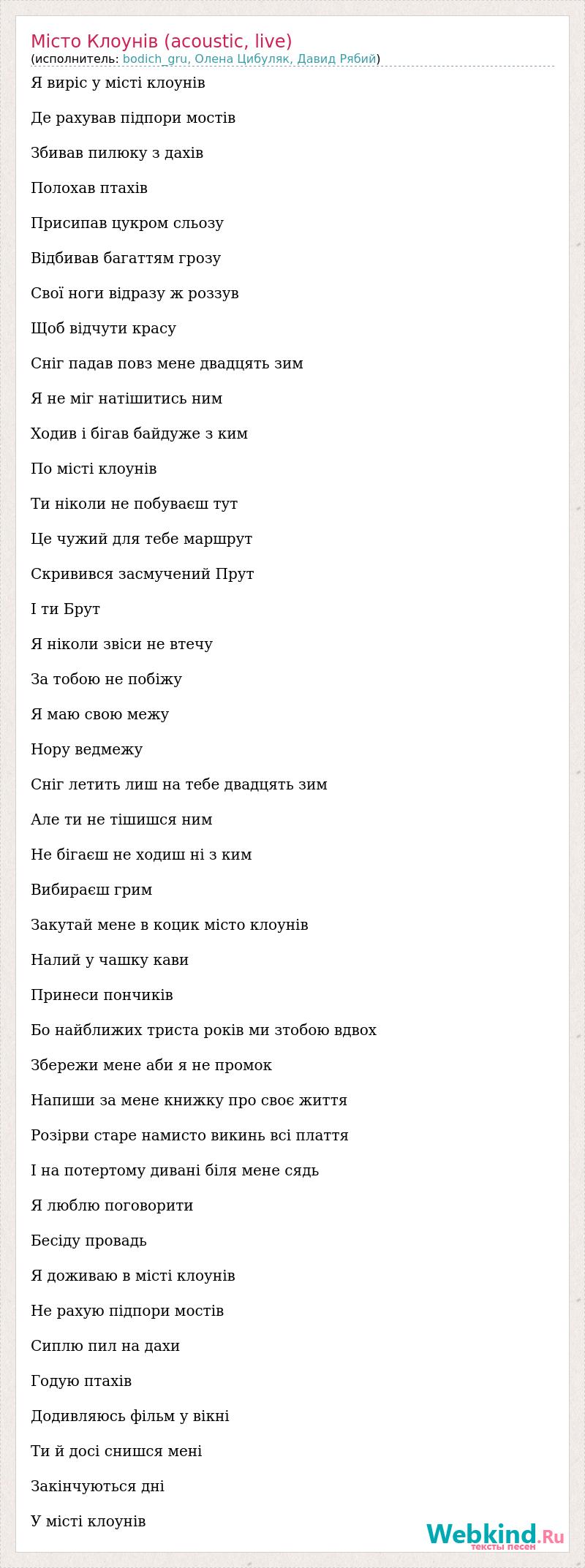 Я виріс у місті клоунів Де рахував підпори мостів Збивав пилюку з дахів Полохав птахів Присипав цукром сльозу Відбивав багаттям грозу Свої ноги відразу ж роззув Щоб відчути красу Сніг падав повз мене двадцять зим Я не міг натішитись ним Ходив і бігав байдуже з ким По місті клоунів Ти ніколи не побуваєш тут Це чужий для тебе маршрут Скривився засмучений Прут І ти Брут Я ніколи звіси не втечу За тобою не побіжу Я маю свою межу Нору ведмежу Сніг летить лиш на тебе двадцять зим Але ти не тішишся ним Не бігаєш не ходиш ні з ким Вибираєш грим Закутай мене в коцик місто клоунів Налий у чашку кави Принеси пончиків Бо найближих триста років ми зтобою вдвох Збережи мене аби я не промок Напиши за мене книжку про своє життя Розірви старе намисто викинь всі плаття І на потертому дивані біля мене сядь Я люблю поговорити Бесіду провадь Я доживаю в місті клоунів Не рахую підпори мостів Сиплю пил на дахи Годую птахів Додивляюсь фільм у вікні Ти й досі снишся мені Закінчуються дні У місті клоунів