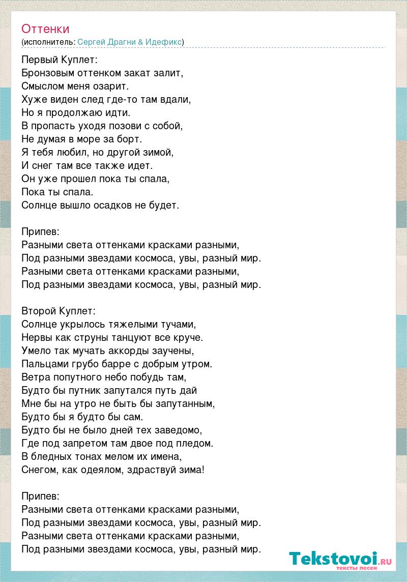 Первый Куплет: Бронзовым оттенком закат залит, Смыслом меня озарит. Хуже виден след где-то там вдали, Но я продолжаю идти. В пропасть уходя позови с собой, Не думая в море за борт. Я тебя любил, но другой зимой, И снег там все также идет. Он уже прошел пока ты спала, Пока ты спала. Солнце вышло осадков не будет. Припев: Разными света оттенками красками разными, Под разными звездами космоса, увы, разный мир. Разными света оттенками красками разными, Под разными звездами космоса, увы, разный мир. Второй Куплет: Солнце укрылось тяжелыми тучами, Нервы как струны танцуют все круче. Умело так мучать аккорды заучены, Пальцами грубо барре с добрым утром. Ветра попутного небо побудь там, Будто бы путник запутался путь дай Мне бы на утро не быть бы запутанным, Будто бы я будто бы сам. Будто бы не было дней тех заведомо, Где под запретом там двое под пледом. В бледных тонах мелом их имена, Снегом, как одеялом, здраствуй зима! Припев: Разными света оттенками красками разными, Под разными звездами космоса, увы, разный мир. Разными света оттенками красками разными, Под разными звездами космоса, увы, разный мир.