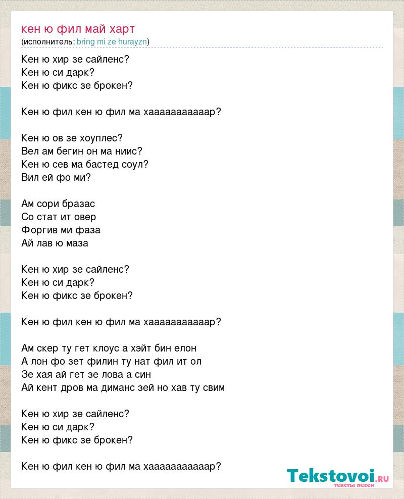 Кен ю хир зе сайленс? Кен ю си дарк? Кен ю фикс зе брокен? Кен ю фил кен ю фил ма хааааааааааар? Кен ю ов зе хоуплес? Вел ам бегин он ма ниис? Кен ю сев ма бастед соул? Вил ей фо ми? Ам сори бразас Со стат ит овер Форгив ми фаза Ай лав ю маза Кен ю хир зе сайленс? Кен ю си дарк? Кен ю фикс зе брокен? Кен ю фил кен ю фил ма хааааааааааар? Ам скер ту гет клоус а хэйт бин елон А лон фо зет филин ту нат фил ит ол Зе хая ай гет зе лова а син Ай кент дров ма диманс зей но хав ту свим Кен ю хир зе сайленс? Кен ю си дарк? Кен ю фикс зе брокен? Кен ю фил кен ю фил ма хааааааааааар?