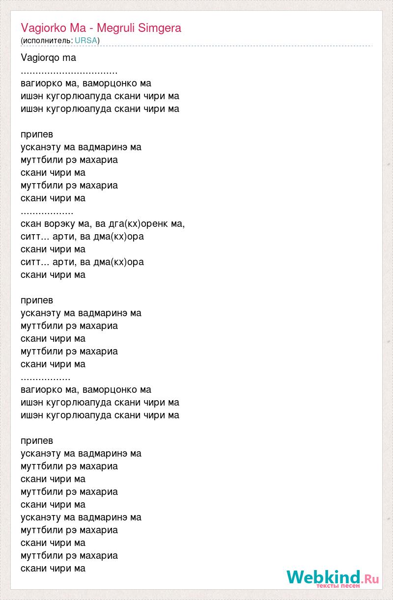 Vagiorqo ma ................................. вагиорко ма, ваморцонко ма ишэн кугорлюапуда скани чири ма ишэн кугорлюапуда скани чири ма припев усканэту ма вадмаринэ ма муттбили рэ махариа скани чири ма муттбили рэ махариа скани чири ма .................. скан ворэку ма, ва дга(кх)оренк ма, ситт... арти, ва дма(кх)ора скани чири ма ситт... арти, ва дма(кх)ора скани чири ма припев усканэту ма вадмаринэ ма муттбили рэ махариа скани чири ма муттбили рэ махариа скани чири ма ................. вагиорко ма, ваморцонко ма ишэн кугорлюапуда скани чири ма ишэн кугорлюапуда скани чири ма припев усканэту ма вадмаринэ ма муттбили рэ махариа скани чири ма муттбили рэ махариа скани чири ма усканэту ма вадмаринэ ма муттбили рэ махариа скани чири ма муттбили рэ махариа скани чири ма