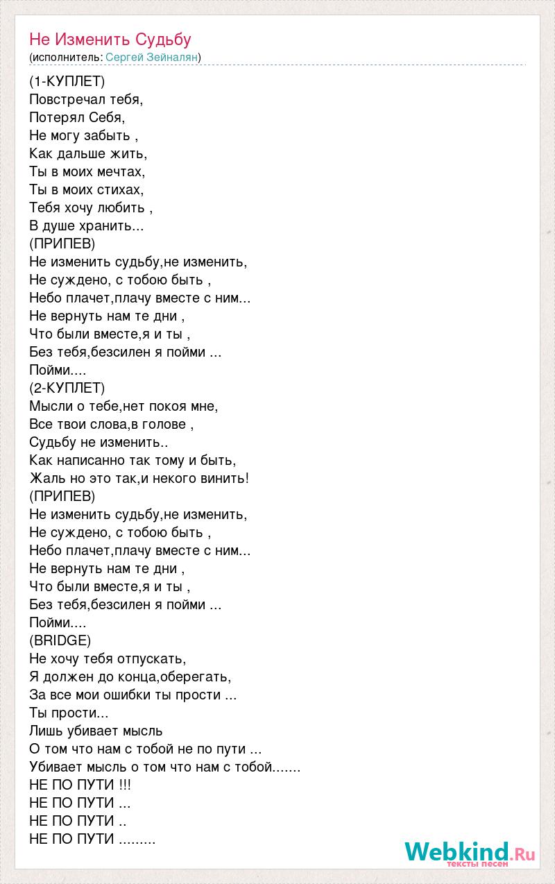 (1-КУПЛЕТ) Повстречал тебя, Потерял Себя, Не могу забыть , Как дальше жить, Ты в моих мечтах, Ты в моих стихах, Тебя хочу любить , В душе хранить... (ПРИПЕВ) Не изменить судьбу,не изменить, Не суждено, с тобою быть , Небо плачет,плачу вместе с ним... Не вернуть нам те дни , Что были вместе,я и ты , Без тебя,безсилен я пойми ... Пойми.... (2-КУПЛЕТ) Мысли о тебе,нет покоя мне, Все твои слова,в голове , Судьбу не изменить.. Как написанно так тому и быть, Жаль но это так,и некого винить! (ПРИПЕВ) Не изменить судьбу,не изменить, Не суждено, с тобою быть , Небо плачет,плачу вместе с ним... Не вернуть нам те дни , Что были вместе,я и ты , Без тебя,безсилен я пойми ... Пойми.... (BRIDGE) Не хочу тебя отпускать, Я должен до конца,оберегать, За все мои ошибки ты прости ... Ты прости... Лишь убивает мысль О том что нам с тобой не по пути ... Убивает мысль о том что нам с тобой....... НЕ ПО ПУТИ !!! НЕ ПО ПУТИ ... НЕ ПО ПУТИ .. НЕ ПО ПУТИ .........