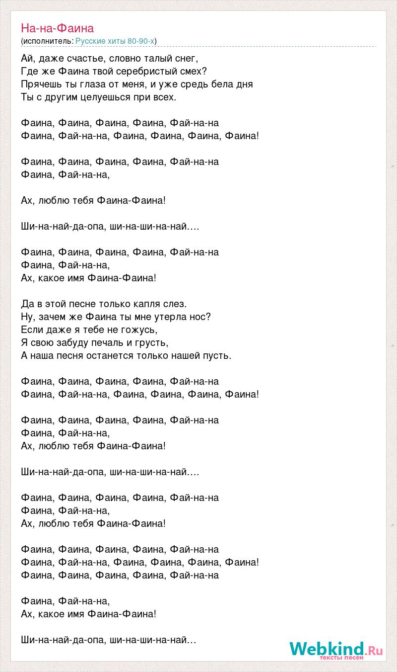 Ай, даже счастье, словно талый снег, Где же Фаина твой серебристый смех? Прячешь ты глаза от меня, и уже средь бела дня Ты с другим целуешься при всех. Фаина, Фаина, Фаина, Фаина, Фай-на-на Фаина, Фай-на-на, Фаина, Фаина, Фаина, Фаина! Фаина, Фаина, Фаина, Фаина, Фай-на-на Фаина, Фай-на-на, Ах, люблю тебя Фаина-Фаина! Ши-на-най-да-опа, ши-на-ши-на-най…. Фаина, Фаина, Фаина, Фаина, Фай-на-на Фаина, Фай-на-на, Ах, какое имя Фаина-Фаина! Да в этой песне только капля слез. Ну, зачем же Фаина ты мне утерла нос? Если даже я тебе не гожусь, Я свою забуду печаль и грусть, А наша песня останется только нашей пусть. Фаина, Фаина, Фаина, Фаина, Фай-на-на Фаина, Фай-на-на, Фаина, Фаина, Фаина, Фаина! Фаина, Фаина, Фаина, Фаина, Фай-на-на Фаина, Фай-на-на, Ах, люблю тебя Фаина-Фаина! Ши-на-най-да-опа, ши-на-ши-на-най…. Фаина, Фаина, Фаина, Фаина, Фай-на-на Фаина, Фай-на-на, Ах, люблю тебя Фаина-Фаина! Фаина, Фаина, Фаина, Фаина, Фай-на-на Фаина, Фай-на-на, Фаина, Фаина, Фаина, Фаина! Фаина, Фаина, Фаина, Фаина, Фай-на-на Фаина, Фай-на-на, Ах, какое имя Фаина-Фаина! Ши-на-най-да-опа, ши-на-ши-на-най…