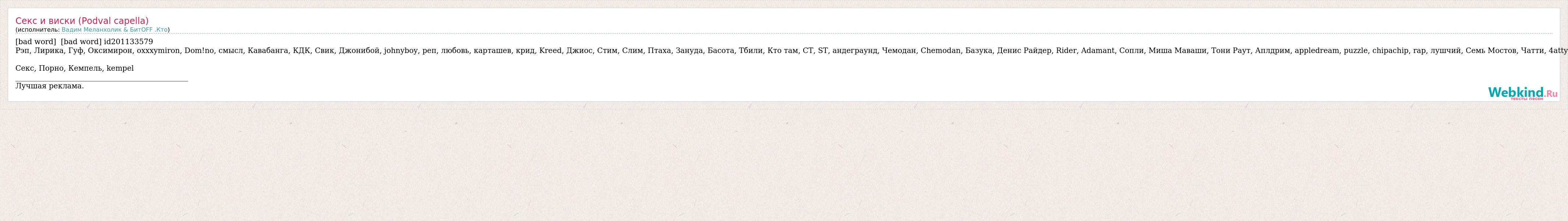 [bad word] [bad word] id201133579 Рэп, Лирика, Гуф, Оксимирон, oxxxymiron, Dom!no, смысл, Кавабанга, КДК, Свик, Джонибой, johnyboy, реп, любовь, карташев, крид, Kreed, Джиос, Стим, Слим, Птаха, Зануда, Басота, Тбили, Кто там, СТ, ST, андеграунд, Чемодан, Chemodan, Базука, Денис Райдер, Rider, Adamant, Сопли, Миша Маваши, Тони Раут, Аплдрим, appledream, puzzle, chipachip, rap, лушчий, Семь Мостов, Чатти, 4atty Секс, Порно, Кемпель, kempel _______________________________________________ Лучшая реклама.