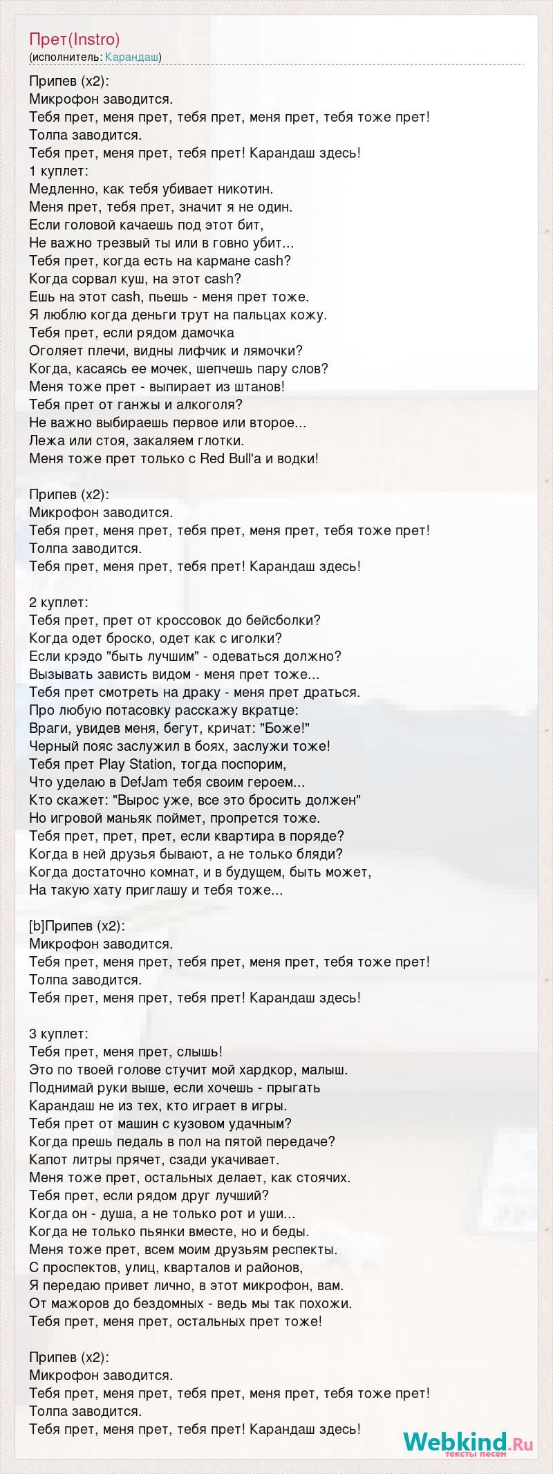 Припев (х2): Микрофон заводится. Тебя прет, меня прет, тебя прет, меня прет, тебя тоже прет! Толпа заводится. Тебя прет, меня прет, тебя прет! Карандаш здесь! 1 куплет: Медленно, как тебя убивает никотин. Меня прет, тебя прет, значит я не один. Если головой качаешь под этот бит, Не важно трезвый ты или в говно убит... Тебя прет, когда есть на кармане cash? Когда сорвал куш, на этот cash? Ешь на этот cash, пьешь - меня прет тоже. Я люблю когда деньги трут на пальцах кожу. Тебя прет, если рядом дамочка Оголяет плечи, видны лифчик и лямочки? Когда, касаясь ее мочек, шепчешь пару слов? Меня тоже прет - выпирает из штанов! Тебя прет от ганжы и алкоголя? Не важно выбираешь первое или второе... Лежа или стоя, закаляем глотки. Меня тоже прет только с Red Bull'а и водки! Припев (х2): Микрофон заводится. Тебя прет, меня прет, тебя прет, меня прет, тебя тоже прет! Толпа заводится. Тебя прет, меня прет, тебя прет! Карандаш здесь! 2 куплет: Тебя прет, прет от кроссовок до бейсболки? Когда одет броско, одет как с иголки? Если крэдо "быть лучшим" - одеваться должно? Вызывать зависть видом - меня прет тоже... Тебя прет смотреть на драку - меня прет драться. Про любую потасовку расскажу вкратце: Враги, увидев меня, бегут, кричат: "Боже!" Черный пояс заслужил в боях, заслужи тоже! Тебя прет Play Station, тогда поспорим, Что уделаю в DefJam тебя своим героем... Кто скажет: "Вырос уже, все это бросить должен" Но игровой маньяк поймет, пропрется тоже. Тебя прет, прет, прет, если квартира в поряде? Когда в ней друзья бывают, а не только бляди? Когда достаточно комнат, и в будущем, быть может, На такую хату приглашу и тебя тоже... [b]Припев (х2): Микрофон заводится. Тебя прет, меня прет, тебя прет, меня прет, тебя тоже прет! Толпа заводится. Тебя прет, меня прет, тебя прет! Карандаш здесь! 3 куплет: Тебя прет, меня прет, слышь! Это по твоей голове стучит мой хардкор, малыш. Поднимай руки выше, если хочешь - прыгать Карандаш не из тех, кто играет в игры. Тебя прет от машин с кузовом удачным? Когда прешь педаль в пол на пятой передаче? Капот литры прячет, сзади укачивает. Меня тоже прет, остальных делает, как стоячих. Тебя прет, если рядом друг лучший? Когда он - душа, а не только рот и уши... Когда не только пьянки вместе, но и беды. Меня тоже прет, всем моим друзьям респекты. С проспектов, улиц, кварталов и районов, Я передаю привет лично, в этот микрофон, вам. От мажоров до бездомных - ведь мы так похожи. Тебя прет, меня прет, остальных прет тоже! Припев (х2): Микрофон заводится. Тебя прет, меня прет, тебя прет, меня прет, тебя тоже прет! Толпа заводится. Тебя прет, меня прет, тебя прет! Карандаш здесь!