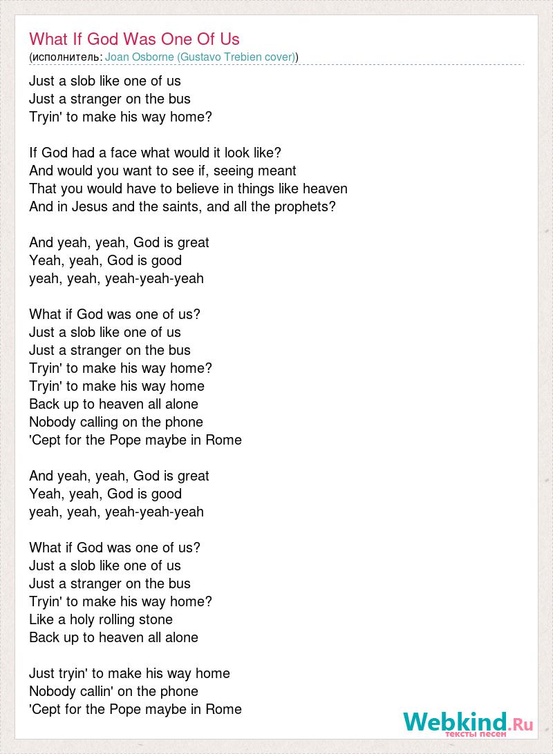 Just a slob like one of us Just a stranger on the bus Tryin' to make his way home? If God had a face what would it look like? And would you want to see if, seeing meant That you would have to believe in things like heaven And in Jesus and the saints, and all the prophets? And yeah, yeah, God is great Yeah, yeah, God is good yeah, yeah, yeah-yeah-yeah What if God was one of us? Just a slob like one of us Just a stranger on the bus Tryin' to make his way home? Tryin' to make his way home Back up to heaven all alone Nobody calling on the phone 'Cept for the Pope maybe in Rome And yeah, yeah, God is great Yeah, yeah, God is good yeah, yeah, yeah-yeah-yeah What if God was one of us? Just a slob like one of us Just a stranger on the bus Tryin' to make his way home? Like а holy rolling stone Back up to heaven all alone Just tryin' to make his way home Nobody callin' on the phone 'Cept for the Pope maybe in Rome