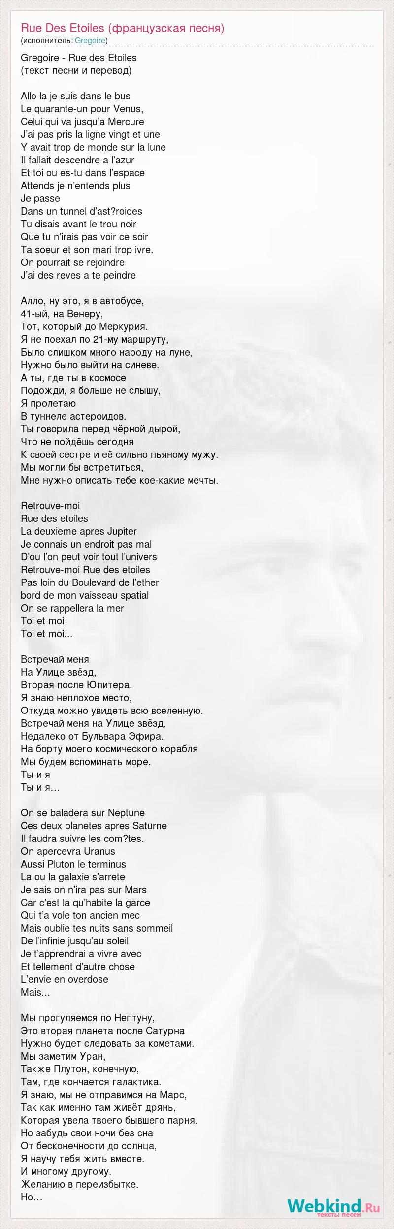 Gregoire - Rue des Etoiles (текст песни и перевод) Allo la je suis dans le bus Le quarante-un pour Venus, Celui qui va jusqu’a Mercure J’ai pas pris la ligne vingt et une Y avait trop de monde sur la lune Il fallait descendre a l’azur Et toi ou es-tu dans l’espace Attends je n’entends plus Je passe Dans un tunnel d’ast?roides Tu disais avant le trou noir Que tu n’irais pas voir ce soir Ta soeur et son mari trop ivre. On pourrait se rejoindre J’ai des reves a te peindre Алло, ну это, я в автобусе, 41-ый, на Венеру, Тот, который до Меркурия. Я не поехал по 21-му маршруту, Было слишком много народу на луне, Нужно было выйти на синеве. А ты, где ты в космосе Подожди, я больше не слышу, Я пролетаю В туннеле астероидов. Ты говорила перед чёрной дырой, Что не пойдёшь сегодня К своей сестре и её сильно пьяному мужу. Мы могли бы встретиться, Мне нужно описать тебе кое-какие мечты. Retrouve-moi Rue des etoiles La deuxieme apres Jupiter Je connais un endroit pas mal D’ou l’on peut voir tout l’univers Retrouve-moi Rue des etoiles Pas loin du Boulevard de l’ether bord de mon vaisseau spatial On se rappellera la mer Toi et moi Toi et moi... Встречай меня На Улице звёзд, Вторая после Юпитера. Я знаю неплохое место, Откуда можно увидеть всю вселенную. Встречай меня на Улице звёзд, Недалеко от Бульвара Эфира. На борту моего космического корабля Мы будем вспоминать море. Ты и я Ты и я… On se baladera sur Neptune Ces deux planetes apres Saturne Il faudra suivre les com?tes. On apercevra Uranus Aussi Pluton le terminus La ou la galaxie s’arrete Je sais on n’ira pas sur Mars Car c’est la qu’habite la garce Qui t’a vole ton ancien mec Mais oublie tes nuits sans sommeil De l’infinie jusqu’au soleil Je t’apprendrai a vivre avec Et tellement d’autre chose L’envie en overdose Mais... Мы прогуляемся по Нептуну, Это вторая планета после Сатурна Нужно будет следовать за кометами. Мы заметим Уран, Также Плутон, конечную, Там, где кончается галактика. Я знаю, мы не отправимся на Марс, Так как именно там живёт дрянь, Которая увела твоего бывшего парня. Но забудь свои ночи без сна От бесконечности до солнца, Я научу тебя жить вместе. И многому другому. Желанию в переизбытке. Но…