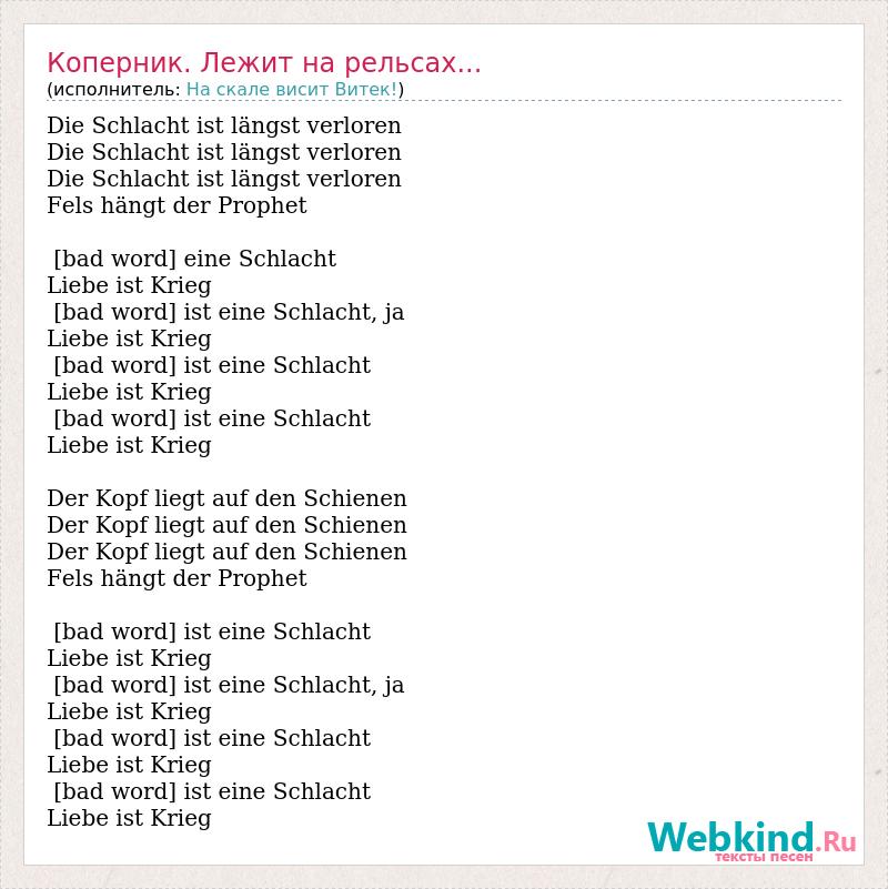 Die Schlacht ist längst verloren Die Schlacht ist längst verloren Die Schlacht ist längst verloren Fels hängt der Prophet [bad word] eine Schlacht Liebe ist Krieg [bad word] ist eine Schlacht, ja Liebe ist Krieg [bad word] ist eine Schlacht Liebe ist Krieg [bad word] ist eine Schlacht Liebe ist Krieg Der Kopf liegt auf den Schienen Der Kopf liegt auf den Schienen Der Kopf liegt auf den Schienen Fels hängt der Prophet [bad word] ist eine Schlacht Liebe ist Krieg [bad word] ist eine Schlacht, ja Liebe ist Krieg [bad word] ist eine Schlacht Liebe ist Krieg [bad word] ist eine Schlacht Liebe ist Krieg
