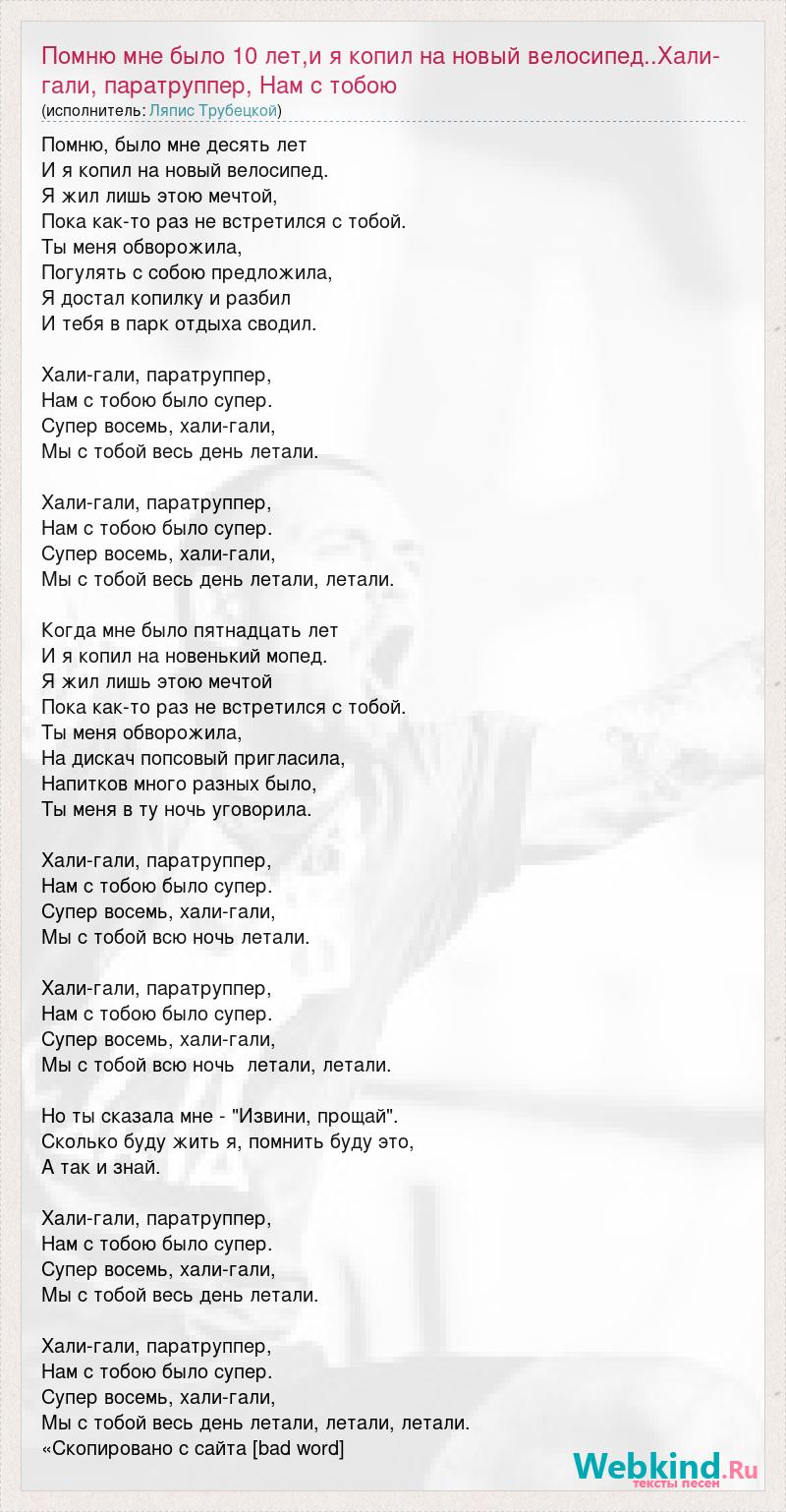 Помню, было мне десять лет И я копил на новый велосипед. Я жил лишь этою мечтой, Пока как-то раз не встретился с тобой. Ты меня обворожила, Погулять с собою предложила, Я достал копилку и разбил И тебя в парк отдыха сводил. Хали-гали, паратруппер, Нам с тобою было супер. Супер восемь, хали-гали, Мы с тобой весь день летали. Хали-гали, паратруппер, Нам с тобою было супер. Супер восемь, хали-гали, Мы с тобой весь день летали, летали. Когда мне было пятнадцать лет И я копил на новенький мопед. Я жил лишь этою мечтой Пока как-то раз не встретился с тобой. Ты меня обворожила, На дискач попсовый пригласила, Напитков много разных было, Ты меня в ту ночь уговорила. Хали-гали, паратруппер, Нам с тобою было супер. Супер восемь, хали-гали, Мы с тобой всю ночь летали. Хали-гали, паратруппер, Нам с тобою было супер. Супер восемь, хали-гали, Мы с тобой всю ночь летали, летали. Но ты сказала мне - "Извини, прощай". Сколько буду жить я, помнить буду это, А так и знай. Хали-гали, паратруппер, Нам с тобою было супер. Супер восемь, хали-гали, Мы с тобой весь день летали. Хали-гали, паратруппер, Нам с тобою было супер. Супер восемь, хали-гали, Мы с тобой весь день летали, летали, летали. «Скопировано с сайта [bad word]