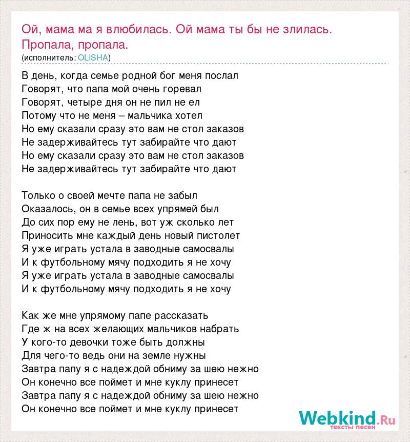Ой, мама ма я влюбилась. Ой мама ты бы не злилась. Пропала, пропала.