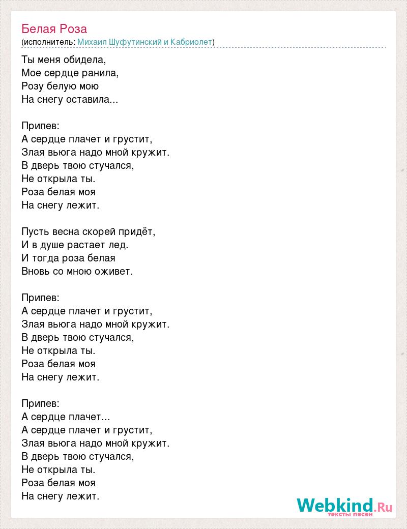 Ты меня обидела, Мое сердце ранила, Розу белую мою На снегу оставила... Припев: А сердце плачет и грустит, Злая вьюга надо мной кружит. В дверь твою стучался, Не открыла ты. Роза белая моя На снегу лежит. Пусть весна скорей придёт, И в душе растает лед. И тогда роза белая Вновь со мною оживет. Припев: А сердце плачет и грустит, Злая вьюга надо мной кружит. В дверь твою стучался, Не открыла ты. Роза белая моя На снегу лежит. Припев: А сердце плачет... А сердце плачет и грустит, Злая вьюга надо мной кружит. В дверь твою стучался, Не открыла ты. Роза белая моя На снегу лежит.