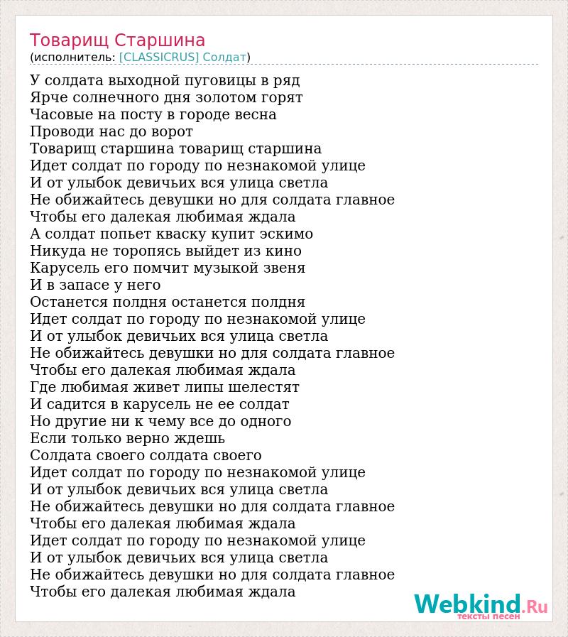 У солдата выходной пуговицы в ряд Ярче солнечного дня золотом горят Часовые на посту в городе весна Проводи нас до ворот Товарищ старшина товарищ старшина Идет солдат по городу по незнакомой улице И от улыбок девичьих вся улица светла Не обижайтесь девушки но для солдата главное Чтобы его далекая любимая ждала А солдат попьет кваску купит эскимо Никуда не торопясь выйдет из кино Карусель его помчит музыкой звеня И в запасе у него Останется полдня останется полдня Идет солдат по городу по незнакомой улице И от улыбок девичьих вся улица светла Не обижайтесь девушки но для солдата главное Чтобы его далекая любимая ждала Где любимая живет липы шелестят И садится в карусель не ее солдат Но другие ни к чему все до одного Если только верно ждешь Солдата своего солдата своего Идет солдат по городу по незнакомой улице И от улыбок девичьих вся улица светла Не обижайтесь девушки но для солдата главное Чтобы его далекая любимая ждала Идет солдат по городу по незнакомой улице И от улыбок девичьих вся улица светла Не обижайтесь девушки но для солдата главное Чтобы его далекая любимая ждала