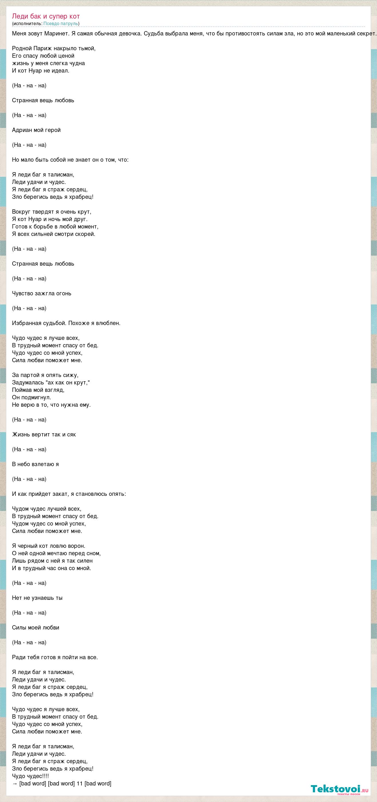 Меня зовут Маринет. Я самая обычная девочка. Судьба выбрала меня, что бы противостоять силам зла, но это мой маленький секрет. Родной Париж накрыло тьмой, Его спасу любой ценой жизнь у меня слегка чудна И кот Нуар не идеал. (На - на - на) Странная вещь любовь (На - на - на) Адриан мой герой (На - на - на) Но мало быть собой не знает он о том, что: Я леди баг я талисман, Леди удачи и чудес. Я леди баг я страж сердец, Зло берегись ведь я храбрец! Вокруг твердят я очень крут, Я кот Нуар и ночь мой друг. Готов к борьбе в любой момент, Я всех сильней смотри скорей. (На - на - на) Странная вещь любовь (На - на - на) Чувство зажгла огонь (На - на - на) Избранная судьбой. Похоже я влюблен. Чудо чудес я лучше всех, В трудный момент спасу от бед. Чудо чудес со мной успех, Сила любви поможет мне. За партой я опять сижу, Задумалась "ах как он крут," Поймав мой взгляд, Он подмигнул. Не верю в то, что нужна ему. (На - на - на) Жизнь вертит так и сяк (На - на - на) В небо взлетаю я (На - на - на) И как прийдет закат, я становлюсь опять: Чудом чудес лучшей всех, В трудный момент спасу от бед. Чудом чудес со мной успех, Сила любви поможет мне. Я черный кот ловлю ворон. О ней одной мечтаю перед сном, Лишь рядом с ней я так силен И в трудный час она со мной. (На - на - на) Нет не узнаешь ты (На - на - на) Силы моей любви (На - на - на) Ради тебя готов я пойти на все. Я леди баг я талисман, Леди удачи и чудес. Я леди баг я страж сердец, Зло берегись ведь я храбрец! Чудо чудес я лучше всех, В трудный момент спасу от бед. Чудо чудес со мной успех, Сила любви поможет мне. Я леди баг я талисман, Леди удачи и чудес. Я леди баг я страж сердец, Зло берегись ведь я храбрец! Чудо чудес!!!! → [bad word] [bad word] 11 [bad word]