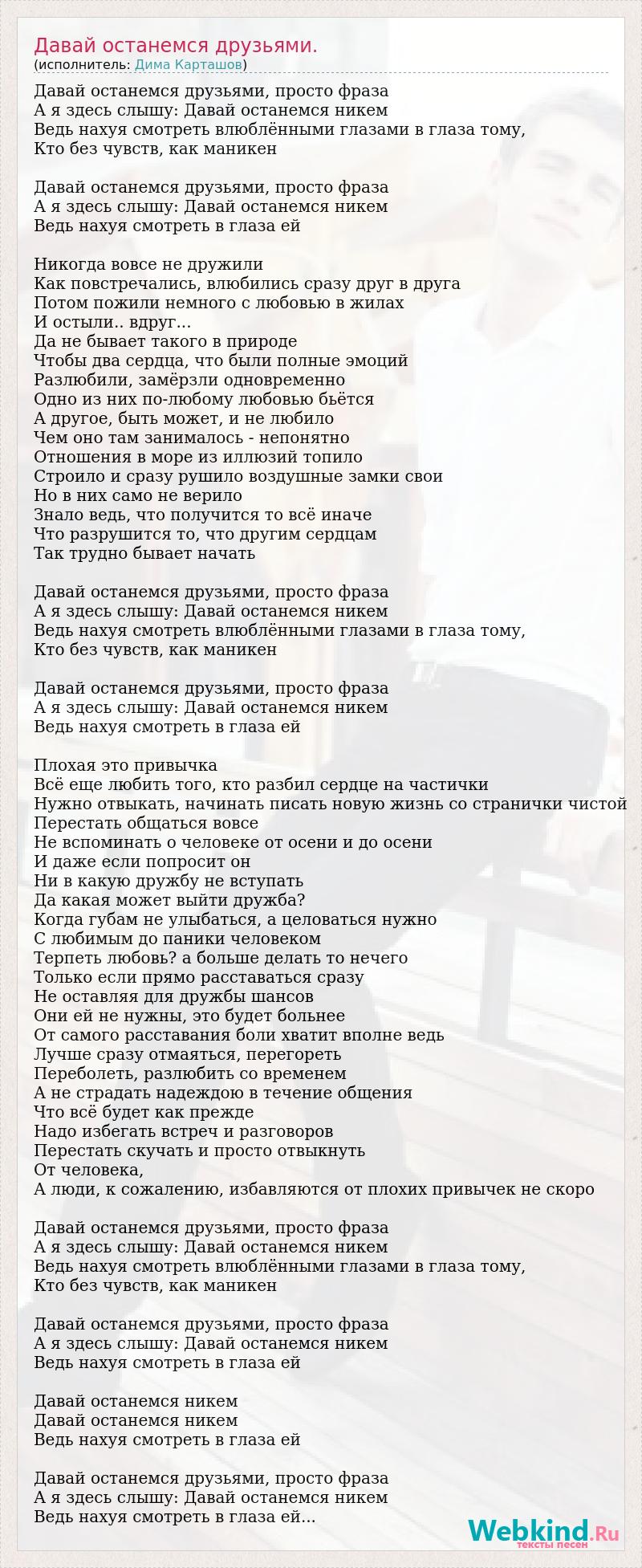 Давай останемся друзьями, просто фраза А я здесь слышу: Давай останемся никем Ведь нахуя смотреть влюблёнными глазами в глаза тому, Кто без чувств, как маникен Давай останемся друзьями, просто фраза А я здесь слышу: Давай останемся никем Ведь нахуя смотреть в глаза ей Никогда вовсе не дружили Как повстречались, влюбились сразу друг в друга Потом пожили немного с любовью в жилах И остыли.. вдруг... Да не бывает такого в природе Чтобы два сердца, что были полные эмоций Разлюбили, замёрзли одновременно Одно из них по-любому любовью бьётся А другое, быть может, и не любило Чем оно там занималось - непонятно Отношения в море из иллюзий топило Строило и сразу рушило воздушные замки свои Но в них само не верило Знало ведь, что получится то всё иначе Что разрушится то, что другим сердцам Так трудно бывает начать Давай останемся друзьями, просто фраза А я здесь слышу: Давай останемся никем Ведь нахуя смотреть влюблёнными глазами в глаза тому, Кто без чувств, как маникен Давай останемся друзьями, просто фраза А я здесь слышу: Давай останемся никем Ведь нахуя смотреть в глаза ей Плохая это привычка Всё еще любить того, кто разбил сердце на частички Нужно отвыкать, начинать писать новую жизнь со странички чистой Перестать общаться вовсе Не вспоминать о человеке от осени и до осени И даже если попросит он Ни в какую дружбу не вступать Да какая может выйти дружба? Когда губам не улыбаться, а целоваться нужно С любимым до паники человеком Терпеть любовь? а больше делать то нечего Только если прямо расставаться сразу Не оставляя для дружбы шансов Они ей не нужны, это будет больнее От самого расставания боли хватит вполне ведь Лучше сразу отмаяться, перегореть Переболеть, разлюбить со временем А не страдать надеждою в течение общения Что всё будет как прежде Надо избегать встреч и разговоров Перестать скучать и просто отвыкнуть От человека, А люди, к сожалению, избавляются от плохих привычек не скоро Давай останемся друзьями, просто фраза А я здесь слышу: Давай останемся никем Ведь нахуя смотреть влюблёнными глазами в глаза тому, Кто без чувств, как маникен Давай останемся друзьями, просто фраза А я здесь слышу: Давай останемся никем Ведь нахуя смотреть в глаза ей Давай останемся никем Давай останемся никем Ведь нахуя смотреть в глаза ей Давай останемся друзьями, просто фраза А я здесь слышу: Давай останемся никем Ведь нахуя смотреть в глаза ей...