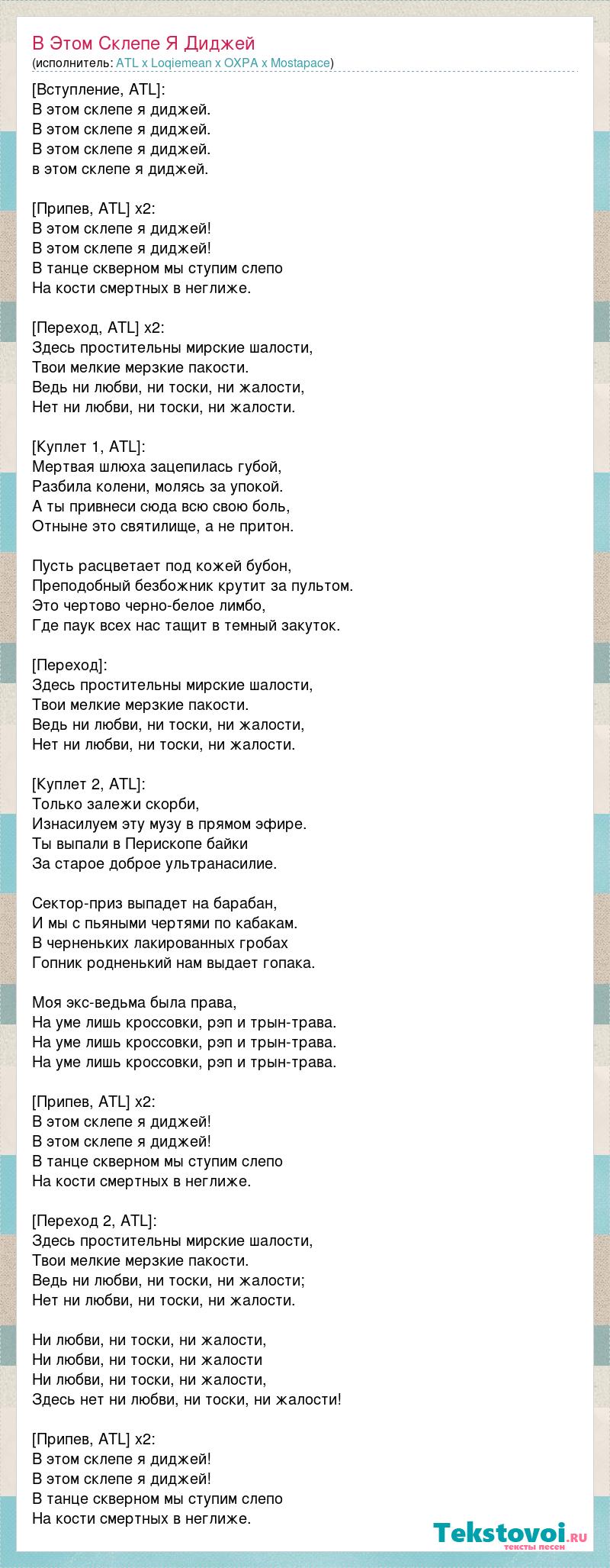 [Вступление, ATL]: В этом склепе я диджей. В этом склепе я диджей. В этом склепе я диджей. в этом склепе я диджей. [Припев, ATL] х2: В этом склепе я диджей! В этом склепе я диджей! В танце скверном мы ступим слепо На кости смертных в неглиже. [Переход, ATL] x2: Здесь простительны мирские шалости, Твои мелкие мерзкие пакости. Ведь ни любви, ни тоски, ни жалости, Нет ни любви, ни тоски, ни жалости. [Куплет 1, ATL]: Мертвая шлюха зацепилась губой, Разбила колени, молясь за упокой. А ты привнеси сюда всю свою боль, Отныне это святилище, а не притон. Пусть расцветает под кожей бубон, Преподобный безбожник крутит за пультом. Это чертово черно-белое лимбо, Где паук всех нас тащит в темный закуток. [Переход]: Здесь простительны мирские шалости, Твои мелкие мерзкие пакости. Ведь ни любви, ни тоски, ни жалости, Нет ни любви, ни тоски, ни жалости. [Куплет 2, ATL]: Только залежи скорби, Изнасилуем эту музу в прямом эфире. Ты выпали в Перископе байки За старое доброе ультранасилие. Сектор-приз выпадет на барабан, И мы с пьяными чертями по кабакам. В черненьких лакированных гробах Гопник родненький нам выдает гопака. Моя экс-ведьма была права, На уме лишь кроссовки, рэп и трын-трава. На уме лишь кроссовки, рэп и трын-трава. На уме лишь кроссовки, рэп и трын-трава. [Припев, ATL] х2: В этом склепе я диджей! В этом склепе я диджей! В танце скверном мы ступим слепо На кости смертных в неглиже. [Переход 2, ATL]: Здесь простительны мирские шалости, Твои мелкие мерзкие пакости. Ведь ни любви, ни тоски, ни жалости; Нет ни любви, ни тоски, ни жалости. Ни любви, ни тоски, ни жалости, Ни любви, ни тоски, ни жалости Ни любви, ни тоски, ни жалости, Здесь нет ни любви, ни тоски, ни жалости! [Припев, ATL] х2: В этом склепе я диджей! В этом склепе я диджей! В танце скверном мы ступим слепо На кости смертных в неглиже.