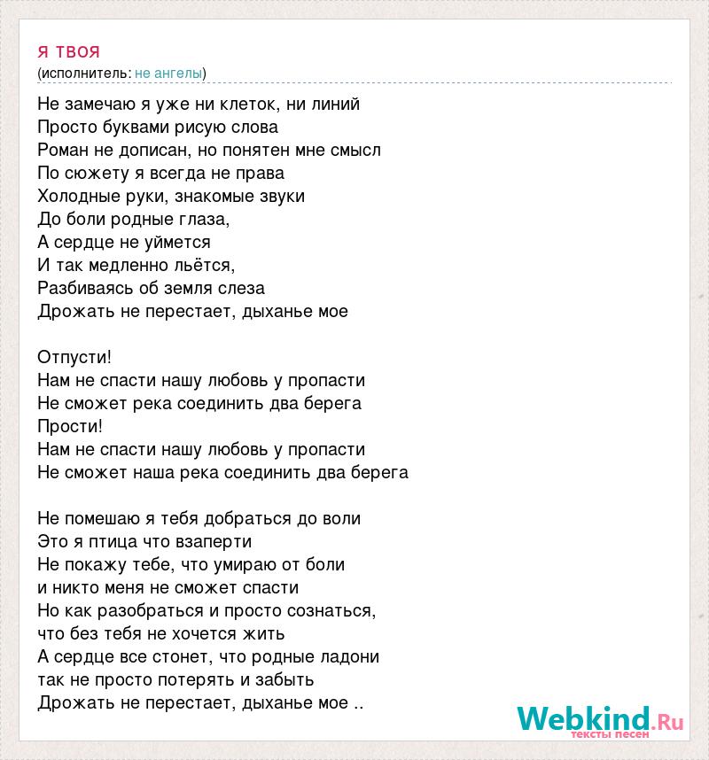 Не замечаю я уже ни клеток, ни линий Просто буквами рисую слова Роман не дописан, но понятен мне смысл По сюжету я всегда не права Холодные руки, знакомые звуки До боли родные глаза, А сердце не уймется И так медленно льётся, Разбиваясь об земля слеза Дрожать не перестает, дыханье мое Отпусти! Нам не спасти нашу любовь у пропасти Не сможет река соединить два берега Прости! Нам не спасти нашу любовь у пропасти Не сможет наша река соединить два берега Не помешаю я тебя добраться до воли Это я птица что взаперти Не покажу тебе, что умираю от боли и никто меня не сможет спасти Но как разобраться и просто сознаться, что без тебя не хочется жить А сердце все стонет, что родные ладони так не просто потерять и забыть Дрожать не перестает, дыханье мое ..