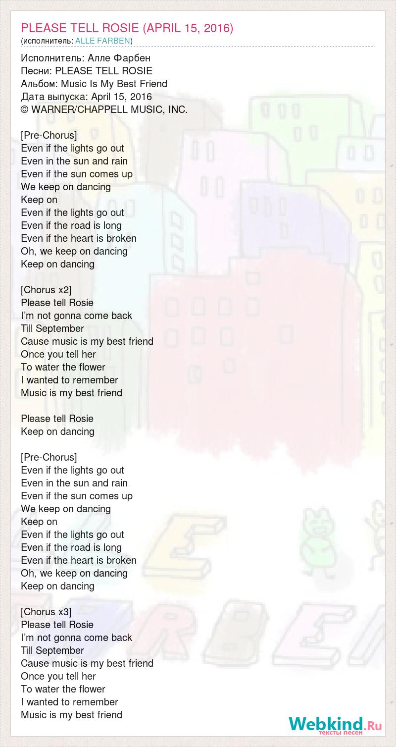 Исполнитель: Алле Фарбен Песни: PLEASE TELL ROSIE Альбом: Music Is My Best Friend Дата выпуска: April 15, 2016 © WARNER/CHAPPELL MUSIC, INC. [Pre-Chorus] Even if the lights go out Even in the sun and rain Even if the sun comes up We keep on dancing Keep on Even if the lights go out Even if the road is long Even if the heart is broken Oh, we keep on dancing Keep on dancing [Chorus x2] Please tell Rosie I’m not gonna come back Till September Cause music is my best friend Once you tell her To water the flower I wanted to remember Music is my best friend Please tell Rosie Keep on dancing [Pre-Chorus] Even if the lights go out Even in the sun and rain Even if the sun comes up We keep on dancing Keep on Even if the lights go out Even if the road is long Even if the heart is broken Oh, we keep on dancing Keep on dancing [Chorus x3] Please tell Rosie I’m not gonna come back Till September Cause music is my best friend Once you tell her To water the flower I wanted to remember Music is my best friend