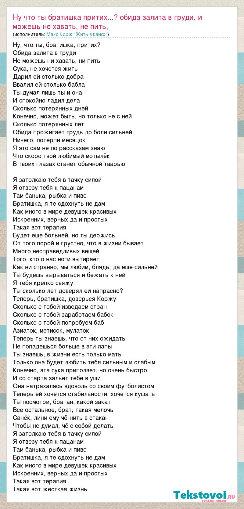 Ну, что ты, братишка, притих? Обида залита в груди Не можешь ни хавать, ни пить Сука, не хочется жить Дарил ей столько добра Ввалил ей столько бабла Ты думал лишь ты и она И спокойно ладил дела Сколько потерянных дней Конечно, может быть, но только не с ней Сколько потерянных лет Обида прожигает грудь до боли сильней Ничего, потерпи месяцок Я это сам не по рассказам знаю Что скоро твой любимый мотылёк В твоих глазах станет обычной тварью Я затолкаю тебя в тачку силой Я отвезу тебя к пацанам Там банька, рыбка и пиво Братишка, я те сдохнуть не дам Как много в мире девушек красивых Искренних, верных да и простых Такая вот терапия Будет еще больней, но ты держись От того порой и грустно, что в жизни бывает Много несправедливых вещей Того, кто о нас ноги вытирает Как ни странно, мы любим, блядь, да еще сильней Ты будешь вырываться и бежать к ней Я тебя крепко свяжу Ты сколько лет доверял ей напрасно? Теперь, братишка, доверься Коржу Сколько с тобой изведаем стран Сколько с тобой заработаем бабок Сколько с тобой попробуем баб Азиаток, метисок, мулаток Теперь ты знаешь, что от них ожидать Не попадешься больше в эти лапы Ты знаешь, в жизни есть только мать Только она будет любить тебя сильным и слабым Конечно, эта сука приползет, но очень быстро И со старта зальёт тебе в уши Она натрахалась вдоволь со своим футболистом Теперь ей хочется стабильности, хочется кушать Ты посмотри, братан, какой закат Все остальное, брат, такая мелочь Санёк, лини ему чё-нить в стакан Чтобы не думал, чё с собой делать Я затолкаю тебя в тачку силой Я отвезу тебя к пацанам Там банька, рыбка и пиво Братишка, я те сдохнуть не дам Как много в мире девушек красивых Искренних, верных да и простых Такая вот терапия Такая вот жёсткая жизнь