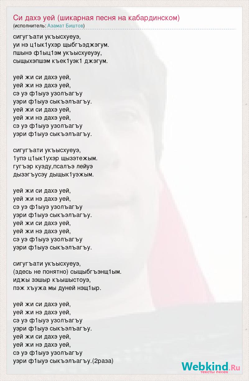 сигугъати укъысхуеуэ, уи нэ ц1ык1ухэр щыбгъэджэгум. пшынэ ф1ыц1эм укъысхуеуэу, сыщыхэпшэм къек1уэк1 джэгум. уей жи си дахэ уей, уей жи нэ дахэ уей, сэ уэ ф1ыуэ узолъагъу уэри ф1ыуэ сыкъэлъагъу. уей жи си дахэ уей, уей жи нэ дахэ уей, сэ уэ ф1ыуэ узолъагъу уэри ф1ыуэ сыкъэлъагъу. сигугъати укъысхуеуэ, 1упэ ц1ык1ухэр щызэтежым. гугъэр куэду,псалъэ лейуэ дызэгъусэу дыщык1уэжым. уей жи си дахэ уей, уей жи нэ дахэ уей, сэ уэ ф1ыуэ узолъагъу уэри ф1ыуэ сыкъэлъагъу. уей жи си дахэ уей, уей жи нэ дахэ уей, сэ уэ ф1ыуэ узолъагъу уэри ф1ыуэ сыкъэлъагъу. сигугъати укъысхуеуэ, (здесь не понятно) сыщыбгъэнщ1ым. иджы зэшыр къышыстоуэ, пэж хъужа мы дуней нэщ1ыр. уей жи си дахэ уей, уей жи нэ дахэ уей, сэ уэ ф1ыуэ узолъагъу уэри ф1ыуэ сыкъэлъагъу. уей жи си дахэ уей, уей жи нэ дахэ уей, сэ уэ ф1ыуэ узолъагъу уэри ф1ыуэ сыкъэлъагъу.(2раза)