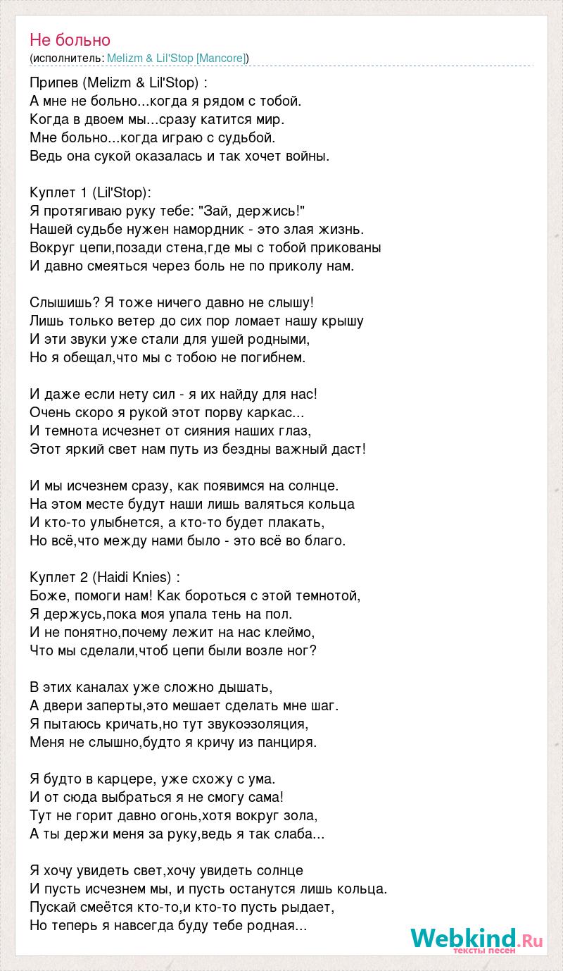Припев (Melizm & Lil'Stop) : А мне не больно...когда я рядом с тобой. Когда в двоем мы...сразу катится мир. Мне больно...когда играю с судьбой. Ведь она сукой оказалась и так хочет войны. Куплет 1 (Lil'Stop): Я протягиваю руку тебе: "Зай, держись!" Нашей судьбе нужен намордник - это злая жизнь. Вокруг цепи,позади стена,где мы с тобой прикованы И давно смеяться через боль не по приколу нам. Слышишь? Я тоже ничего давно не слышу! Лишь только ветер до сих пор ломает нашу крышу И эти звуки уже стали для ушей родными, Но я обещал,что мы с тобою не погибнем. И даже если нету сил - я их найду для нас! Очень скоро я рукой этот порву каркас... И темнота исчезнет от сияния наших глаз, Этот яркий свет нам путь из бездны важный даст! И мы исчезнем сразу, как появимся на солнце. На этом месте будут наши лишь валяться кольца И кто-то улыбнется, а кто-то будет плакать, Но всё,что между нами было - это всё во благо. Куплет 2 (Haidi Knies) : Боже, помоги нам! Как бороться с этой темнотой, Я держусь,пока моя упала тень на пол. И не понятно,почему лежит на нас клеймо, Что мы сделали,чтоб цепи были возле ног? В этих каналах уже сложно дышать, А двери заперты,это мешает сделать мне шаг. Я пытаюсь кричать,но тут звукоэзоляция, Меня не слышно,будто я кричу из панциря. Я будто в карцере, уже схожу с ума. И от сюда выбраться я не смогу сама! Тут не горит давно огонь,хотя вокруг зола, А ты держи меня за руку,ведь я так слаба... Я хочу увидеть свет,хочу увидеть солнце И пусть исчезнем мы, и пусть останутся лишь кольца. Пускай смеётся кто-то,и кто-то пусть рыдает, Но теперь я навсегда буду тебе родная...