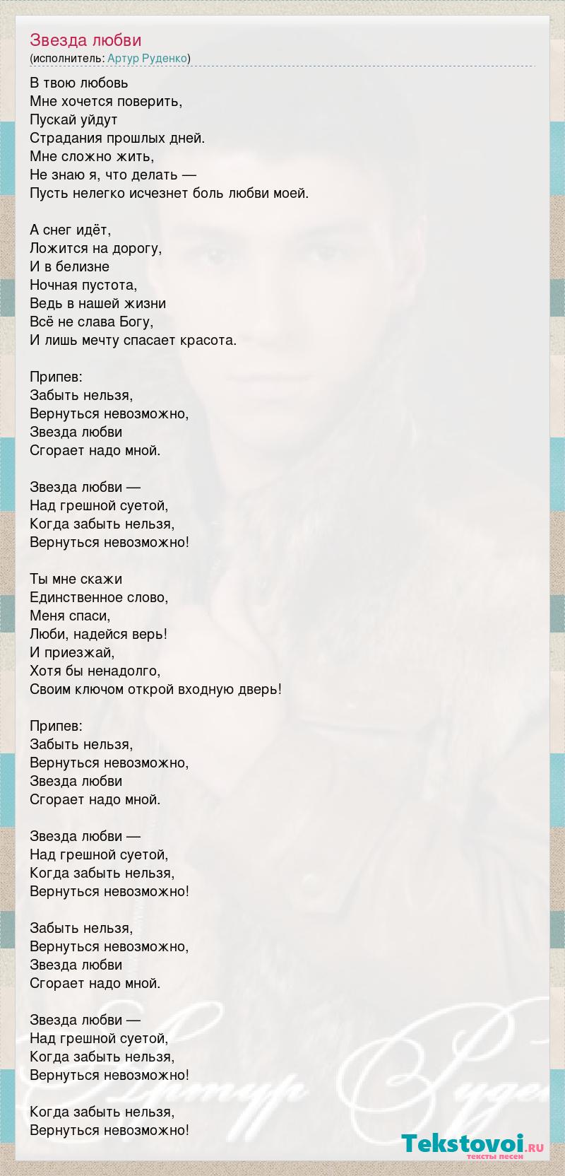 В твою любовь Мне хочется поверить, Пускай уйдут Страдания прошлых дней. Мне сложно жить, Не знаю я, что делать — Пусть нелегко исчезнет боль любви моей. А снег идёт, Ложится на дорогу, И в белизне Ночная пустота, Ведь в нашей жизни Всё не слава Богу, И лишь мечту спасает красота. Припев: Забыть нельзя, Вернуться невозможно, Звезда любви Сгорает надо мной. Звезда любви — Над грешной суетой, Когда забыть нельзя, Вернуться невозможно! Ты мне скажи Единственное слово, Меня спаси, Люби, надейся верь! И приезжай, Хотя бы ненадолго, Своим ключом открой входную дверь! Припев: Забыть нельзя, Вернуться невозможно, Звезда любви Сгорает надо мной. Звезда любви — Над грешной суетой, Когда забыть нельзя, Вернуться невозможно! Забыть нельзя, Вернуться невозможно, Звезда любви Сгорает надо мной. Звезда любви — Над грешной суетой, Когда забыть нельзя, Вернуться невозможно! Когда забыть нельзя, Вернуться невозможно!