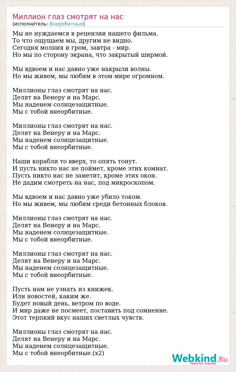 Мы не нуждаемся в рецензии нашего фильма. То что ощущаем мы, другим не видно. Сегодня молния и гром, завтра - мир. Но мы по сторону экрана, что закрытый ширмой. Мы вдвоем и нас давно уже накрыли волны. Но мы живем, мы любим в этом мире огромном. Миллионы глаз смотрят на нас. Делят на Венеру и на Марс. Мы наденем солнцезащитные. Мы с тобой внеорбитные. Миллионы глаз смотрят на нас. Делят на Венеру и на Марс. Мы наденем солнцезащитные. Мы с тобой внеорбитные. Наши корабли то вверх, то опять тонут. И пусть никто нас не поймет, кроме этих комнат. Пусть никто нас не заметит, кроме этих окон. Не дадим смотреть на нас, под микроскопом. Мы вдвоем и нас давно уже убило током. Но мы живем, мы любим среди бетонных блоков. Миллионы глаз смотрят на нас. Делят на Венеру и на Марс. Мы наденем солнцезащитные. Мы с тобой внеорбитные. Миллионы глаз смотрят на нас. Делят на Венеру и на Марс. Мы наденем солнцезащитные. Мы с тобой внеорбитные. Пусть нам не узнать из книжек. Или новостей, каким же. Будет новый день, ветром по воде. И мир даже не посмеет, поставить под сомнение. Этот терпкий вкус наших светлых чувств. Миллионы глаз смотрят на нас. Делят на Венеру и на Марс. Мы наденем солнцезащитные. Мы с тобой внеорбитные.(х2)