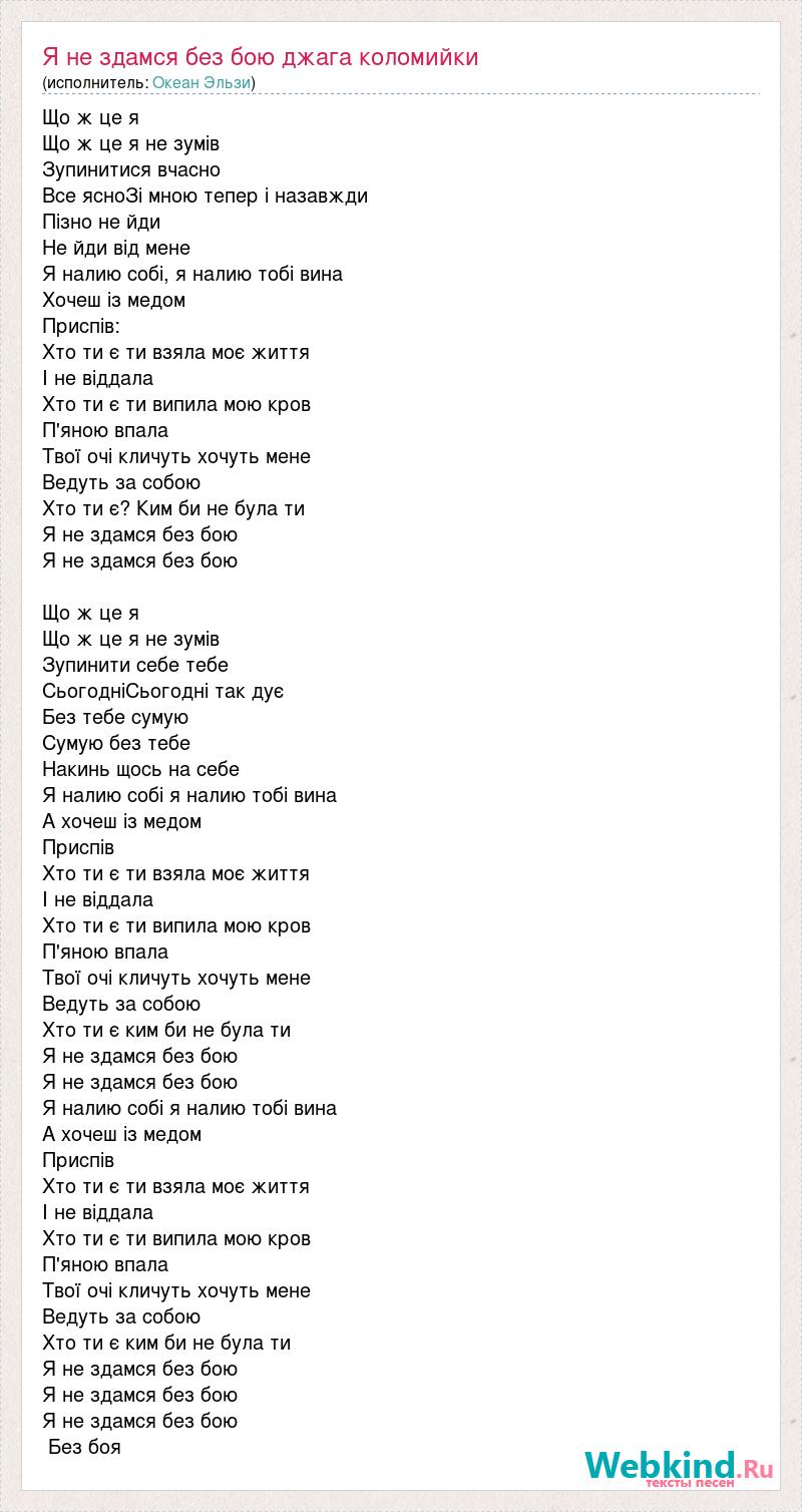 Що ж це я Що ж це я не зумів Зупинитися вчасно Все ясноЗі мною тепер і назавжди Пізно не йди Не йди від мене Я налию собі, я налию тобі вина Хочеш із медом Приспів: Хто ти є ти взяла моє життя І не віддала Хто ти є ти випила мою кров П'яною впала Твої очі кличуть хочуть мене Ведуть за собою Хто ти є? Ким би не була ти Я не здамся без бою Я не здамся без бою Що ж це я Що ж це я не зумів Зупинити себе тебе СьогодніСьогодні так дує Без тебе сумую Сумую без тебе Накинь щось на себе Я налию собі я налию тобі вина А хочеш із медом Приспів Хто ти є ти взяла моє життя І не віддала Хто ти є ти випила мою кров П'яною впала Твої очі кличуть хочуть мене Ведуть за собою Хто ти є ким би не була ти Я не здамся без бою Я не здамся без бою Я налию собі я налию тобі вина А хочеш із медом Приспів Хто ти є ти взяла моє життя І не віддала Хто ти є ти випила мою кров П'яною впала Твої очі кличуть хочуть мене Ведуть за собою Хто ти є ким би не була ти Я не здамся без бою Я не здамся без бою Я не здамся без бою Без боя