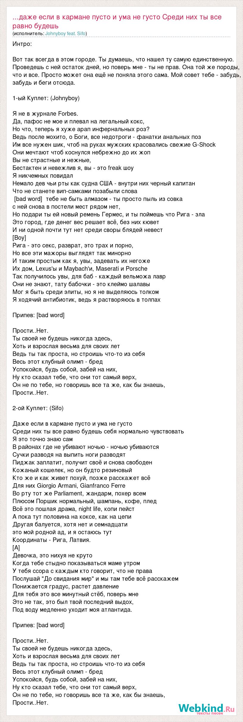 Интро: Вот так всегда в этом городе. Ты думаешь, что нашел ту самую единственную. Проведешь с ней остаток дней, но поверь мне - ты не прав. Она той же породы, что и все. Просто может она ещё не поняла этого сама. Мой совет тебе - забудь, забудь и беги отсюда. 1-ый Куплет: (Johnyboy) Я не в журнале Forbes. Да, пафос не мое и плевал на легальный кокс, Но что, теперь я хуже арап инфернальных роз? Ведь после мохито, о Боги, все недотроги - фанатки анальных поз Им все нужен шик, чтоб на руках мужских красовались свежие G-Shock Они мечтают чтоб коснулся небрежно до их жоп Вы не страстные и нежные, Бестактен и невежлив я, вы - это freak шоу Я никчемных повидал Немало дев чьи рты как судна США - внутри них черный капитан Что не станете вип-самками позабыли слова [bad word] тебе не быть алмазом - ты просто пыль из совка с ней снова в постели мест рядом нет, Но подари ты ей новый ремень Гермес, и ты поймешь что Рига - зла Это город, где денег вес решает всё, без них кювет И ни одной почти тут нет среди своры блядей невест [Воу] Рига - это секс, разврат, это трах и порно, Но все эти мажоры выглядят так минорно И таким простым как я, увы, задевать их негоже Их дом, Lexus'ы и Maybach'и, Maserati и Porsche Так получилось увы, для баб - каждый вельможа лавр Они не знают, тату бабочки - это клеймо шалавы Мог я быть среди элиты, но я не выделяюсь толком Я ходячий антибиотик, ведь я растворяюсь в толпах Припев: [bad word] Прости..Нет. Ты своей не будешь никогда здесь, Хоть и взрослая весьма для своих лет Ведь ты так проста, но строишь что-то из себя Весь этот клубный олимп - бред Успокойся, будь собой, забей на них, Ну кто сказал тебе, что они тот самый верх, Он не по тебе, но говоришь все та же, как бы знаешь, Прости..Нет. 2-ой Куплет: (Sifo) Даже если в кармане пусто и ума не густо Среди них ты все равно будешь себя нормально чувствовать Я это точно знаю сам В районах где не убивают ночью - ночью убиваются Сучки разводя на выпить ноги разводят Пиджак заплатит, получит своё и снова свободен Кожаный кошелек, но он будто резиновый Кто же и как живет похуй, позже расскажет всё Для них Giorgio Armani, Gianfranco Ferre Во рту тот же Parliament, жандарм, похер всем Плюсом Поршик нормальный, шампань, кофе, плед Всё это пошлая драма, night life, копи пейст А пока тут половина на коксе, как на цепи Другая балуется, хотя нет и семнадцати это мой родной ад, и я остаюсь тут Координаты - Рига, Латвия. [А] Девочка, это нихуя не круто Когда тебе стыдно показываться маме утром У тебя ссора с каждым кто говорит, что не права Послушай "До свидания мир" и мы там тебе всё расскажем Понижается градус, растет давление Для тебя это все минутный стёб, поверь мне Это не так, это был твой последний выдох, Под воду медленно уходит моя атлантида. Припев: [bad word] Прости..Нет. Ты своей не будешь никогда здесь, Хоть и взрослая весьма для своих лет Ведь ты так проста, но строишь что-то из себя Весь этот клубный олимп - бред Успокойся, будь собой, забей на них, Ну кто сказал тебе, что они тот самый верх, Он не по тебе, но говоришь все та же, как бы знаешь, Прости..Нет.