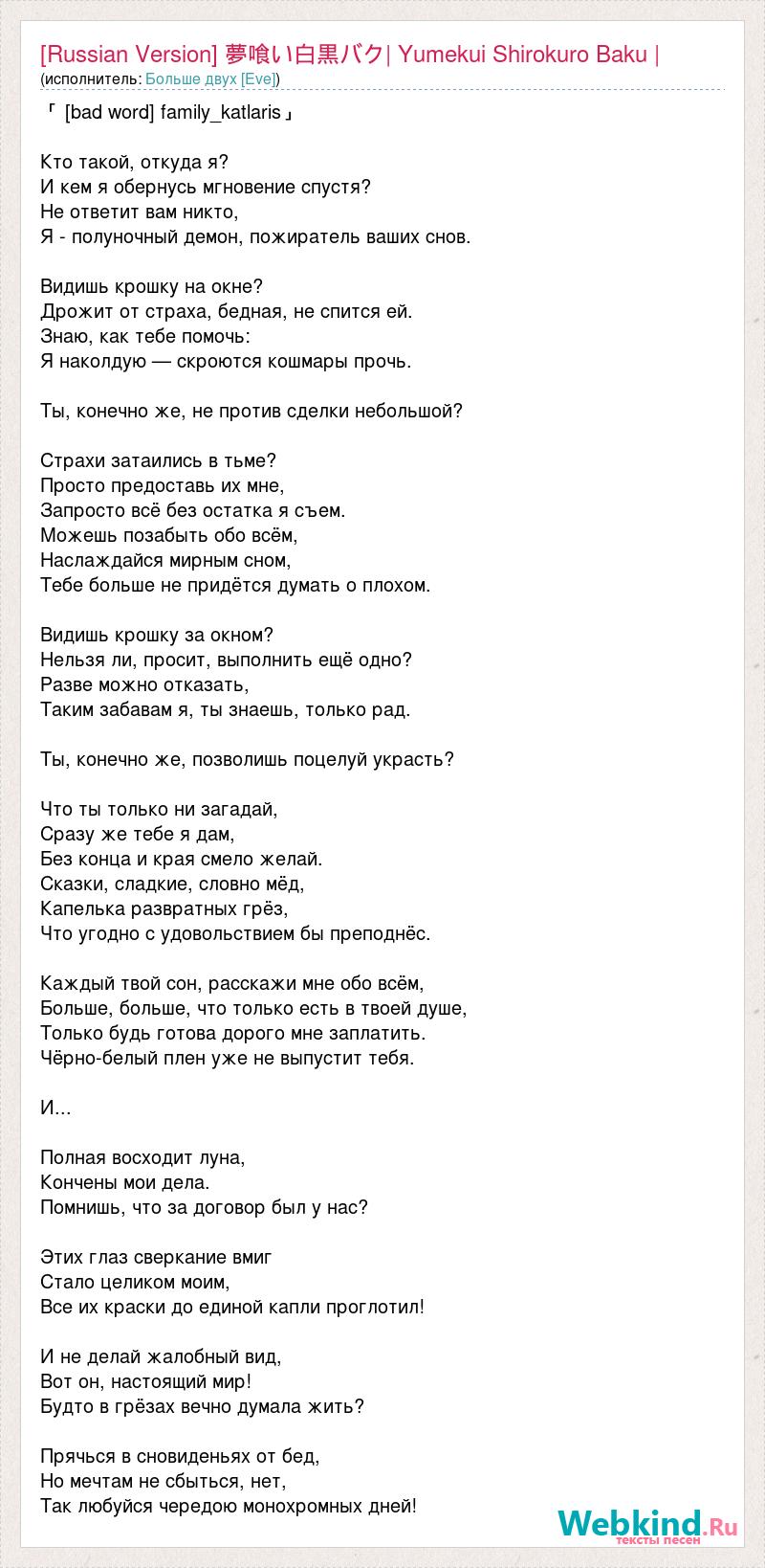 「 [bad word] family_katlaris」 Кто такой, откуда я? И кем я обернусь мгновение спустя? Не ответит вам никто, Я - полуночный демон, пожиратель ваших снов. Видишь крошку на окне? Дрожит от страха, бедная, не спится ей. Знаю, как тебе помочь: Я наколдую — скроются кошмары прочь. Ты, конечно же, не против сделки небольшой? Страхи затаились в тьме? Просто предоставь их мне, Запросто всё без остатка я съем. Можешь позабыть обо всём, Наслаждайся мирным сном, Тебе больше не придётся думать о плохом. Видишь крошку за окном? Нельзя ли, просит, выполнить ещё одно? Разве можно отказать, Таким забавам я, ты знаешь, только рад. Ты, конечно же, позволишь поцелуй украсть? Что ты только ни загадай, Сразу же тебе я дам, Без конца и края смело желай. Сказки, сладкие, словно мёд, Капелька развратных грёз, Что угодно с удовольствием бы преподнёс. Каждый твой сон, расскажи мне обо всём, Больше, больше, что только есть в твоей душе, Только будь готова дорого мне заплатить. Чёрно-белый плен уже не выпустит тебя. И... Полная восходит луна, Кончены мои дела. Помнишь, что за договор был у нас? Этих глаз сверкание вмиг Стало целиком моим, Все их краски до единой капли проглотил! И не делай жалобный вид, Вот он, настоящий мир! Будто в грёзах вечно думала жить? Прячься в сновиденьях от бед, Но мечтам не сбыться, нет, Так любуйся чередою монохромных дней!