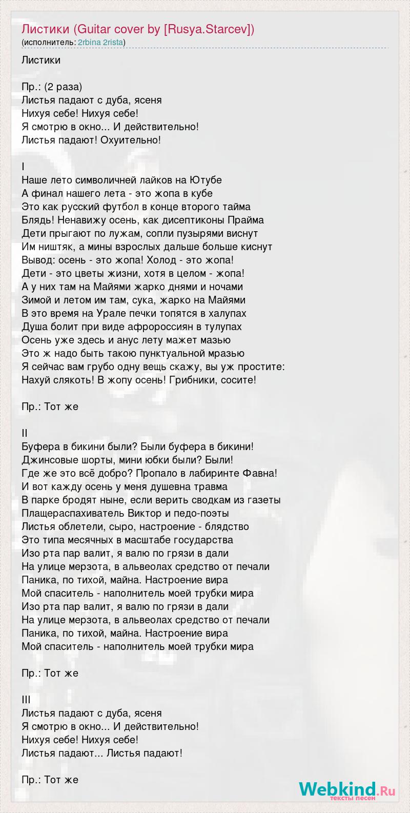 Листики Пр.: (2 раза) Листья падают с дуба, ясеня Нихуя себе! Нихуя себе! Я смотрю в окно... И действительно! Листья падают! Охуительно! I Наше лето символичней лайков на Ютубе А финал нашего лета - это жопа в кубе Это как русский футбол в конце второго тайма Блядь! Ненавижу осень, как дисептиконы Прайма Дети прыгают по лужам, сопли пузырями виснут Им ништяк, а мины взрослых дальше больше киснут Вывод: осень - это жопа! Холод - это жопа! Дети - это цветы жизни, хотя в целом - жопа! А у них там на Майями жарко днями и ночами Зимой и летом им там, сука, жарко на Майями В это время на Урале печки топятся в халупах Душа болит при виде афророссиян в тулупах Осень уже здесь и анус лету мажет мазью Это ж надо быть такою пунктуальной мразью Я сейчас вам грубо одну вещь скажу, вы уж простите: Нахуй слякоть! В жопу осень! Грибники, сосите! Пр.: Тот же II Буфера в бикини были? Были буфера в бикини! Джинсовые шорты, мини юбки были? Были! Где же это всё добро? Пропало в лабиринте Фавна! И вот кажду осень у меня душевна травма В парке бродят ныне, если верить сводкам из газеты Плащераспахиватель Виктор и педо-поэты Листья облетели, сыро, настроение - блядство Это типа месячных в масштабе государства Изо рта пар валит, я валю по грязи в дали На улице мерзота, в альвеолах средство от печали Паника, по тихой, майна. Настроение вира Мой спаситель - наполнитель моей трубки мира Изо рта пар валит, я валю по грязи в дали На улице мерзота, в альвеолах средство от печали Паника, по тихой, майна. Настроение вира Мой спаситель - наполнитель моей трубки мира Пр.: Тот же III Листья падают с дуба, ясеня Я смотрю в окно... И действительно! Нихуя себе! Нихуя себе! Листья падают... Листья падают! Пр.: Тот же