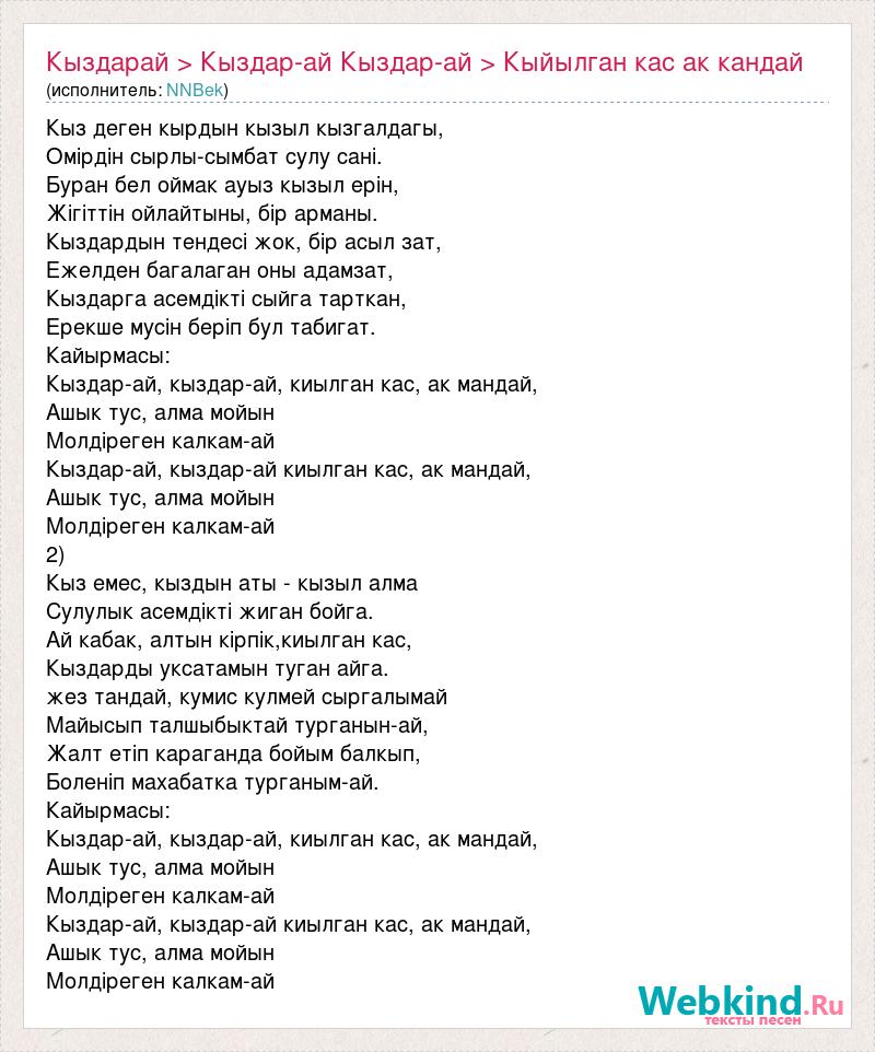 Кыз деген кырдын кызыл кызгалдагы, Омiрдiн сырлы-сымбат сулу санi. Буран бел оймак ауыз кызыл ерiн, Жiгiттiн ойлайтыны, бiр арманы. Кыздардын тендесi жок, бiр асыл зат, Ежелден багалаган оны адамзат, Кыздарга асемдiктi сыйга тарткан, Ерекше мусiн берiп бул табигат. Кайырмасы: Кыздар-ай, кыздар-ай, киылган кас, ак мандай, Ашык тус, алма мойын Молдiреген калкам-ай Кыздар-ай, кыздар-ай киылган кас, ак мандай, Ашык тус, алма мойын Молдiреген калкам-ай 2) Кыз емес, кыздын аты - кызыл алма Сулулык асемдiктi жиган бойга. Ай кабак, алтын кiрпiк,киылган кас, Кыздарды уксатамын туган айга. жез тандай, кумис кулмей сыргалымай Майысып талшыбыктай турганын-ай, Жалт етiп караганда бойым балкып, Боленiп махабатка турганым-ай. Кайырмасы: Кыздар-ай, кыздар-ай, киылган кас, ак мандай, Ашык тус, алма мойын Молдiреген калкам-ай Кыздар-ай, кыздар-ай киылган кас, ак мандай, Ашык тус, алма мойын Молдiреген калкам-ай