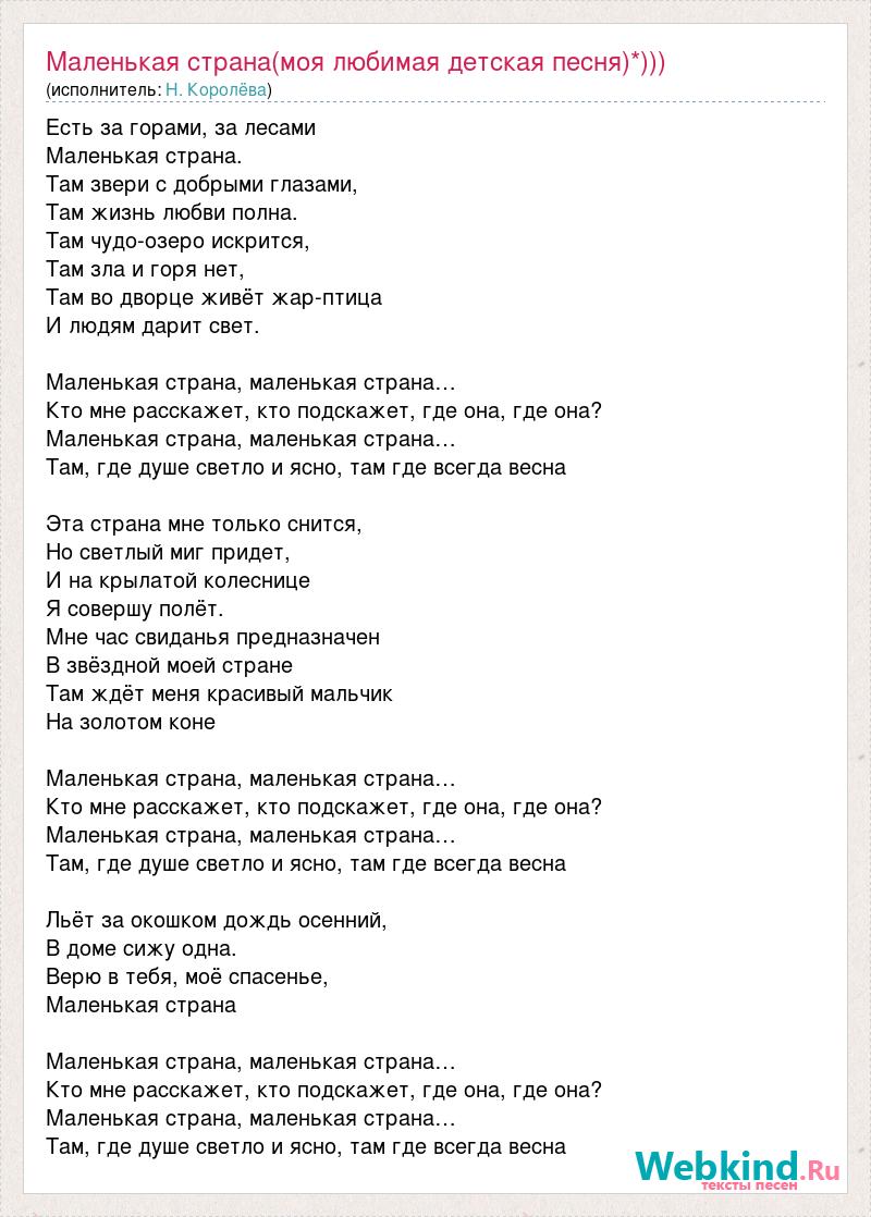 Есть за горами, за лесами Маленькая страна. Там звери с добрыми глазами, Там жизнь любви полна. Там чудо-озеро искрится, Там зла и горя нет, Там во дворце живёт жар-птица И людям дарит свет. Маленькая страна, маленькая страна… Кто мне расскажет, кто подскажет, где она, где она? Маленькая страна, маленькая страна… Там, где душе светло и ясно, там где всегда весна Эта страна мне только снится, Но светлый миг придет, И на крылатой колеснице Я совершу полёт. Мне час свиданья предназначен В звёздной моей стране Там ждёт меня красивый мальчик На золотом коне Маленькая страна, маленькая страна… Кто мне расскажет, кто подскажет, где она, где она? Маленькая страна, маленькая страна… Там, где душе светло и ясно, там где всегда весна Льёт за окошком дождь осенний, В доме сижу одна. Верю в тебя, моё спасенье, Маленькая страна Маленькая страна, маленькая страна… Кто мне расскажет, кто подскажет, где она, где она? Маленькая страна, маленькая страна… Там, где душе светло и ясно, там где всегда весна