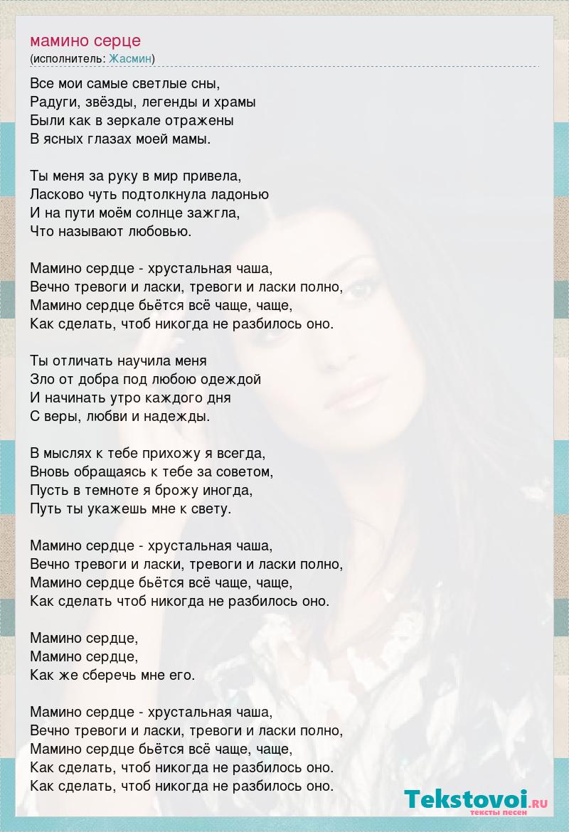 Все мои самые светлые сны, Радуги, звёзды, легенды и храмы Были как в зеркале отражены В ясных глазах моей мамы. Ты меня за руку в мир привела, Ласково чуть подтолкнула ладонью И на пути моём солнце зажгла, Что называют любовью. Мамино сердце - хрустальная чаша, Вечно тревоги и ласки, тревоги и ласки полно, Мамино сердце бьётся всё чаще, чаще, Как сделать, чтоб никогда не разбилось оно. Ты отличать научила меня Зло от добра под любою одеждой И начинать утро каждого дня С веры, любви и надежды. В мыслях к тебе прихожу я всегда, Вновь обращаясь к тебе за советом, Пусть в темноте я брожу иногда, Путь ты укажешь мне к свету. Мамино сердце - хрустальная чаша, Вечно тревоги и ласки, тревоги и ласки полно, Мамино сердце бьётся всё чаще, чаще, Как сделать чтоб никогда не разбилось оно. Мамино сердце, Мамино сердце, Как же сберечь мне его. Мамино сердце - хрустальная чаша, Вечно тревоги и ласки, тревоги и ласки полно, Мамино сердце бьётся всё чаще, чаще, Как сделать, чтоб никогда не разбилось оно. Как сделать, чтоб никогда не разбилось оно.