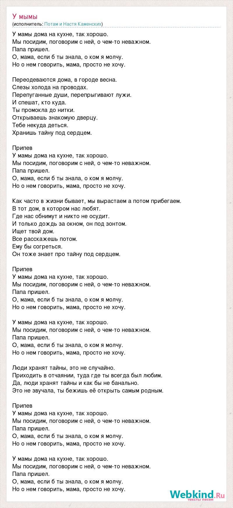 У мамы дома на кухне, так хорошо. Мы посидим, поговорим с ней, о чем-то неважном. Папа пришел. О, мама, если б ты знала, о ком я молчу. Но о нем говорить, мама, просто не хочу. Переодеваются дома, в городе весна. Слезы холода на проводах. Перепуганные души, перепрыгивают лужи. И спешат, кто куда. Ты промокла до нитки. Открываешь знакомую дверцу. Тебе некуда деться. Хранишь тайну под сердцем. Припев У мамы дома на кухне, так хорошо. Мы посидим, поговорим с ней, о чем-то неважном. Папа пришел. О, мама, если б ты знала, о ком я молчу. Но о нем говорить, мама, просто не хочу. Как часто в жизни бывает, мы вырастаем а потом прибегаем. В тот дом, в котором нас любят. Где нас обнимут и никто не осудит. И только дождь за окном, он под зонтом. Ищет твой дом. Все расскажешь потом. Ему бы согреться. Он тоже знает про тайну под сердцем. Припев У мамы дома на кухне, так хорошо. Мы посидим, поговорим с ней, о чем-то неважном. Папа пришел. О, мама, если б ты знала, о ком я молчу. Но о нем говорить, мама, просто не хочу. У мамы дома на кухне, так хорошо. Мы посидим, поговорим с ней, о чем-то неважном. Папа пришел. О, мама, если б ты знала, о ком я молчу. Но о нем говорить, мама, просто не хочу. Люди хранят тайны, это не случайно. Приходить в отчаянии, туда где ты всегда был любим. Да, люди хранят тайны и как бы не банально. Это не звучала, ты бежишь её открыть самым родным. Припев У мамы дома на кухне, так хорошо. Мы посидим, поговорим с ней, о чем-то неважном. Папа пришел. О, мама, если б ты знала, о ком я молчу. Но о нем говорить, мама, просто не хочу. У мамы дома на кухне, так хорошо. Мы посидим, поговорим с ней, о чем-то неважном. Папа пришел. О, мама, если б ты знала, о ком я молчу. Но о нем говорить, мама, просто не хочу.