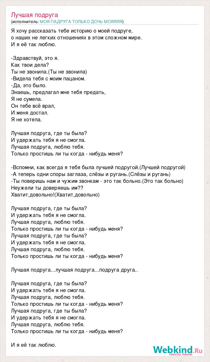 Я хочу рассказать тебе историю о моей подруге, о наших не легких отношениях в этом сложном мире. И я её так люблю. -Здравствуй, это я. Как твои дела? Ты не звонила.(Ты не звонила) -Видела тебя с моим пацаном. -Да, это было. Знаешь, предлагал мне тебя предать, Я не сумела. Он тебе всё врал, И меня достал. Я не хотела. Лучшая подруга, где ты была? И удержать тебя я не смогла. Лучшая подруга, люблю тебя. Только простишь ли ты когда - нибудь меня? -Вспомни, как всегда я тебя была лучшей подругой.(Лучшей подругой) -А теперь одни споры заглаза, слёзы и ругань.(Слёзы и ругань) -Ты поверишь нам и чужим звонкам - это так больно.(Это так больно) Неужели ты доверяешь им?? Хватит,довольно!(Хватит,довольно) Лучшая подруга, где ты была? И удержать тебя я не смогла. Лучшая подруга, люблю тебя. Только простишь ли ты когда - нибудь меня? Лучшая подруга, где ты была? И удержать тебя я не смогла. Лучшая подруга, люблю тебя. Только простишь ли ты когда - нибудь меня? Лучшая подруга...лучшая подруга...подруга друга.. Лучшая подруга, где ты была? И удержать тебя я не смогла. Лучшая подруга, люблю тебя. Только простишь ли ты когда - нибудь меня? Лучшая подруга, где ты была? И удержать тебя я не смогла. Лучшая подруга, люблю тебя. Только простишь ли ты когда - нибудь меня? И я её так люблю.