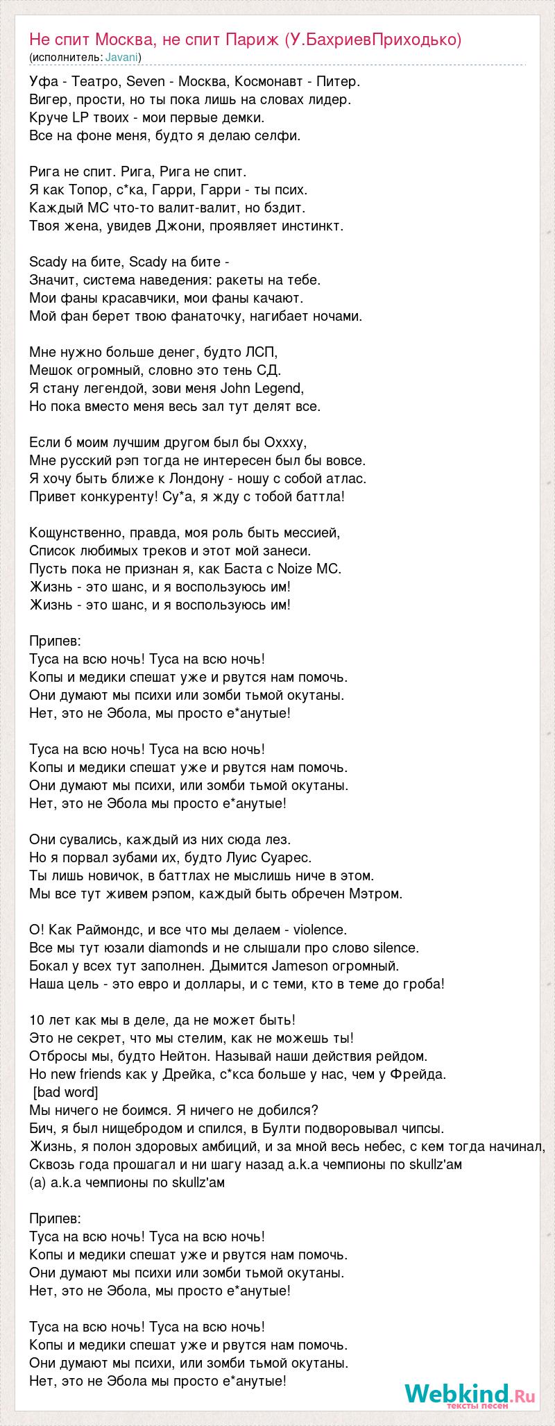 Уфа - Театро, Seven - Москва, Космонавт - Питер. Вигер, прости, но ты пока лишь на словах лидер. Круче LP твоих - мои первые демки. Все на фоне меня, будто я делаю селфи. Рига не спит. Рига, Рига не спит. Я как Топор, с*ка, Гарри, Гарри - ты псих. Каждый МС что-то валит-валит, но бздит. Твоя жена, увидев Джони, проявляет инстинкт. Scady на бите, Scady на бите - Значит, система наведения: ракеты на тебе. Мои фаны красавчики, мои фаны качают. Мой фан берет твою фанаточку, нагибает ночами. Мне нужно больше денег, будто ЛСП, Мешок огромный, словно это тень СД. Я стану легендой, зови меня John Legend, Но пока вместо меня весь зал тут делят все. Если б моим лучшим другом был бы Oxxxy, Мне русский рэп тогда не интересен был бы вовсе. Я хочу быть ближе к Лондону - ношу с собой атлас. Привет конкуренту! Су*а, я жду с тобой баттла! Кощунственно, правда, моя роль быть мессией, Список любимых треков и этот мой занеси. Пусть пока не признан я, как Баста с Noize MC. Жизнь - это шанс, и я воспользуюсь им! Жизнь - это шанс, и я воспользуюсь им! Припев: Туса на всю ночь! Туса на всю ночь! Копы и медики спешат уже и рвутся нам помочь. Они думают мы психи или зомби тьмой окутаны. Нет, это не Эбола, мы просто е*анутые! Туса на всю ночь! Туса на всю ночь! Копы и медики спешат уже и рвутся нам помочь. Они думают мы психи, или зомби тьмой окутаны. Нет, это не Эбола мы просто е*анутые! Они сувались, каждый из них сюда лез. Но я порвал зубами их, будто Луис Суарес. Ты лишь новичок, в баттлах не мыслишь ниче в этом. Мы все тут живем рэпом, каждый быть обречен Мэтром. О! Как Раймондс, и все что мы делаем - violence. Все мы тут юзали diamonds и не слышали про слово silence. Бокал у всех тут заполнен. Дымится Jameson огромный. Наша цель - это евро и доллары, и с теми, кто в теме до гроба! 10 лет как мы в деле, да не может быть! Это не секрет, что мы стелим, как не можешь ты! Отбросы мы, будто Нейтон. Называй наши действия рейдом. Но new friends как у Дрейка, с*кса больше у нас, чем у Фрейда. [bad word] Мы ничего не боимся. Я ничего не добился? Бич, я был нищебродом и спился, в Булти подворовывал чипсы. Жизнь, я полон здоровых амбиций, и за мной весь небес, с кем тогда начинал, Сквозь года прошагал и ни шагу назад a.k.a чемпионы по skullz'ам (а) a.k.a чемпионы по skullz'ам Припев: Туса на всю ночь! Туса на всю ночь! Копы и медики спешат уже и рвутся нам помочь. Они думают мы психи или зомби тьмой окутаны. Нет, это не Эбола, мы просто е*анутые! Туса на всю ночь! Туса на всю ночь! Копы и медики спешат уже и рвутся нам помочь. Они думают мы психи, или зомби тьмой окутаны. Нет, это не Эбола мы просто е*анутые!