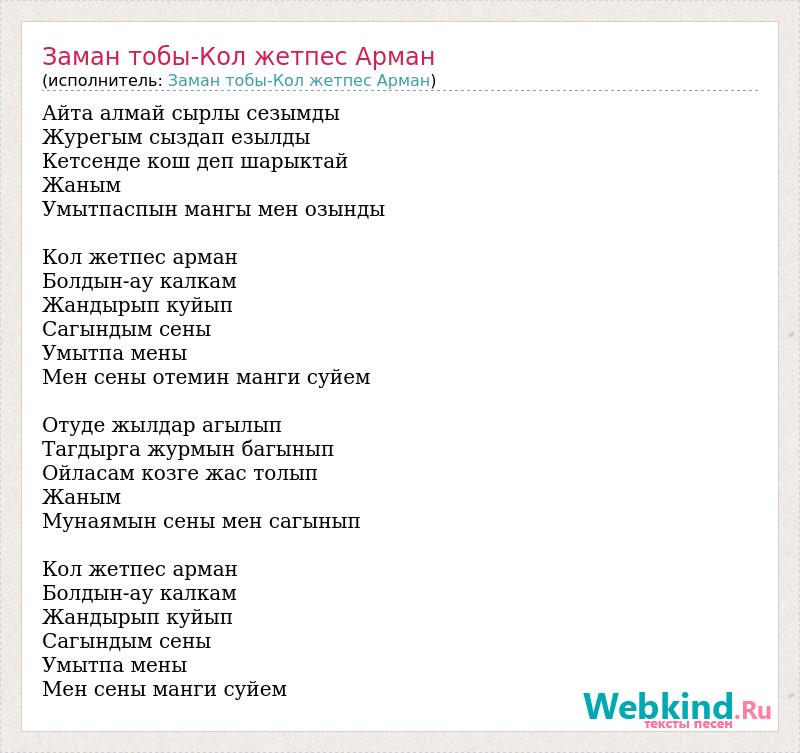 Айта алмай сырлы сезымды Журегым сыздап езылды Кетсенде кош деп шарыктай Жаным Умытпаспын мангы мен озынды Кол жетпес арман Болдын-ау калкам Жандырып куйып Сагындым сены Умытпа мены Мен сены отемин манги суйем Отуде жылдар агылып Тагдырга журмын багынып Ойласам козге жас толып Жаным Мунаямын сены мен сагынып Кол жетпес арман Болдын-ау калкам Жандырып куйып Сагындым сены Умытпа мены Мен сены манги суйем