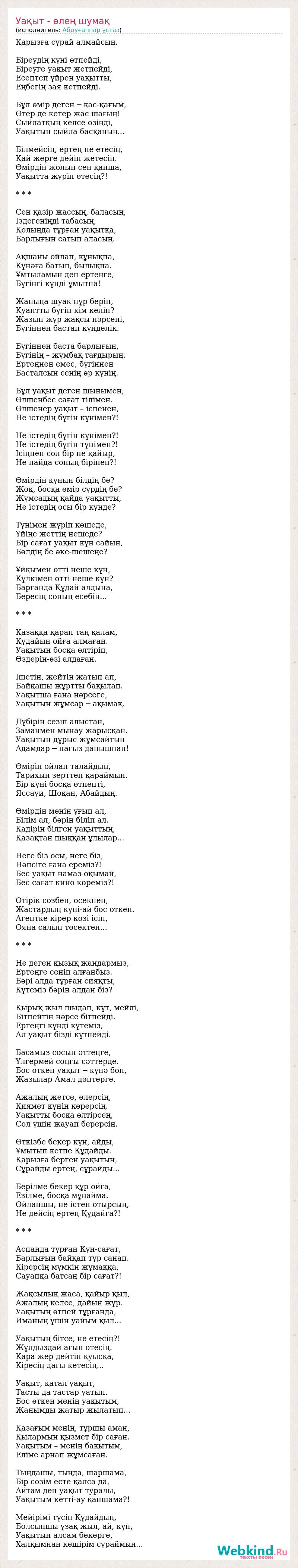 Қарызға сұрай алмайсың. Біреудің күні өтпейді, Біреуге уақыт жетпейді, Есептеп үйрен уақытты, Еңбегің зая кетпейді. Бұл өмір деген ─ қас-қағым, Өтер де кетер жас шағың! Сыйлатқың келсе өзіңді, Уақытын сыйла басқаның... Білмейсің, ертең не етесің, Қай жерге дейін жетесің. Өмірдің жолын сен қанша, Уақытта жүріп өтесің?! * * * Сен қазір жассың, баласың, Іздегеніңді табасың, Қолыңда тұрған уақытқа, Барлығын сатып аласың. Ақшаны ойлап, құнықпа, Күнәға батып, былықпа. Ұмтыламын деп ертеңге, Бүгінгі күнді ұмытпа! Жаныңа шуақ нұр беріп, Қуантты бүгін кім келіп? Жазып жүр жақсы нәрсені, Бүгіннен бастап күнделік. Бүгіннен баста барлығын, Бүгінің – жұмбақ тағдырың. Ертеңнен емес, бүгіннен Басталсын сенің әр күнің. Бұл уақыт деген шынымен, Өлшенбес сағат тілімен. Өлшенер уақыт – іспенен, Не істедің бүгін күнімен?! Не істедің бүгін күнімен?! Не істедің бүгін түнімен?! Ісіңнен сол бір не қайыр, Не пайда соның бірінен?! Өмірдің құнын білдің бе? Жоқ, босқа өмір сүрдің бе? Жұмсадың қайда уақытты, Не істедің осы бір күнде? Түнімен жүріп көшеде, Үйіңе жеттің нешеде? Бір сағат уақыт күн сайын, Бөлдің бе әке-шешеңе? Ұйқымен өтті неше күн, Күлкімен өтті неше күн? Барғанда Құдай алдына, Бересің соның есебін... * * * Қазаққа қарап таң қалам, Құдайын ойға алмаған. Уақытын босқа өлтіріп, Өздерін-өзі алдаған. Ішетін, жейтін жатып ап, Байқашы жұртты бақылап. Уақытша ғана нәрсеге, Уақытын жұмсар ─ ақымақ. Дүбірін сезіп алыстан, Заманмен мынау жарысқан. Уақытын дұрыс жұмсайтын Адамдар ─ нағыз данышпан! Өмірін ойлап талайдың, Тарихын зерттеп қараймын. Бір күні босқа өтпепті, Яссауи, Шоқан, Абайдың. Өмірдің мәнін ұғып ал, Білім ал, бәрін біліп ал. Қадірін білген уақыттың, Қазақтан шыққан ұлылар... Неге біз осы, неге біз, Нәпсіге ғана ереміз?! Бес уақыт намаз оқымай, Бес сағат кино көреміз?! Өтірік сөзбен, өсекпен, Жастардың күні-ай бос өткен. Агентке кірер көзі ісіп, Ояна салып төсектен... * * * Не деген қызық жандармыз, Ертеңге сеніп алғанбыз. Бәрі алда тұрған сияқты, Күтеміз бәрін алдан біз? Қырық жыл шыдап, күт, мейлі, Бітпейтін нәрсе бітпейді. Ертеңгі күнді күтеміз, Ал уақыт бізді күтпейді. Басамыз сосын әттеңге, Үлгермей соңғы сәттерде. Бос өткен уақыт ─ күнә боп, Жазылар Амал дәптерге. Ажалың жетсе, өлерсің, Қиямет күнін көрерсің. Уақытты босқа өлтірсең, Сол үшін жауап берерсің. Өткізбе бекер күн, айды, Ұмытып кетпе Құдайды. Қарызға берген уақытын, Сұрайды ертең, сұрайды... Берілме бекер құр ойға, Езілме, босқа мұңайма. Ойланшы, не істеп отырсың, Не дейсің ертең Құдайға?! * * * Аспанда тұрған Күн-сағат, Барлығын байқап тұр санап. Кірерсің мүмкін жұмаққа, Сауапқа батсаң бір сағат?! Жақсылық жаса, қайыр қыл, Ажалың келсе, дайын жүр. Уақытың өтпей тұрғанда, Иманың үшiн уайым қыл... Уақытың бітсе, не етесің?! Жұлдыздай ағып өтесің. Қара жер дейтін қуысқа, Кіресің дағы кетесің... Уақыт, қатал уақыт, Тасты да тастар уатып. Бос өткен менің уақытым, Жанымды жатыр жылатып... Қазағым менің, тұршы аман, Қылармын қызмет бір саған. Уақытым – менің бақытым, Еліме арнап жұмсаған. Тыңдашы, тыңда, шаршама, Бір сөзім есте қалса да, Айтам деп уақыт туралы, Уақытым кетті-ау қаншама?! Мейірімі түсіп Құдайдың, Болсыншы ұзақ жыл, ай, күн, Уақытын алсам бекерге, Халқымнан кешірім сұраймын...