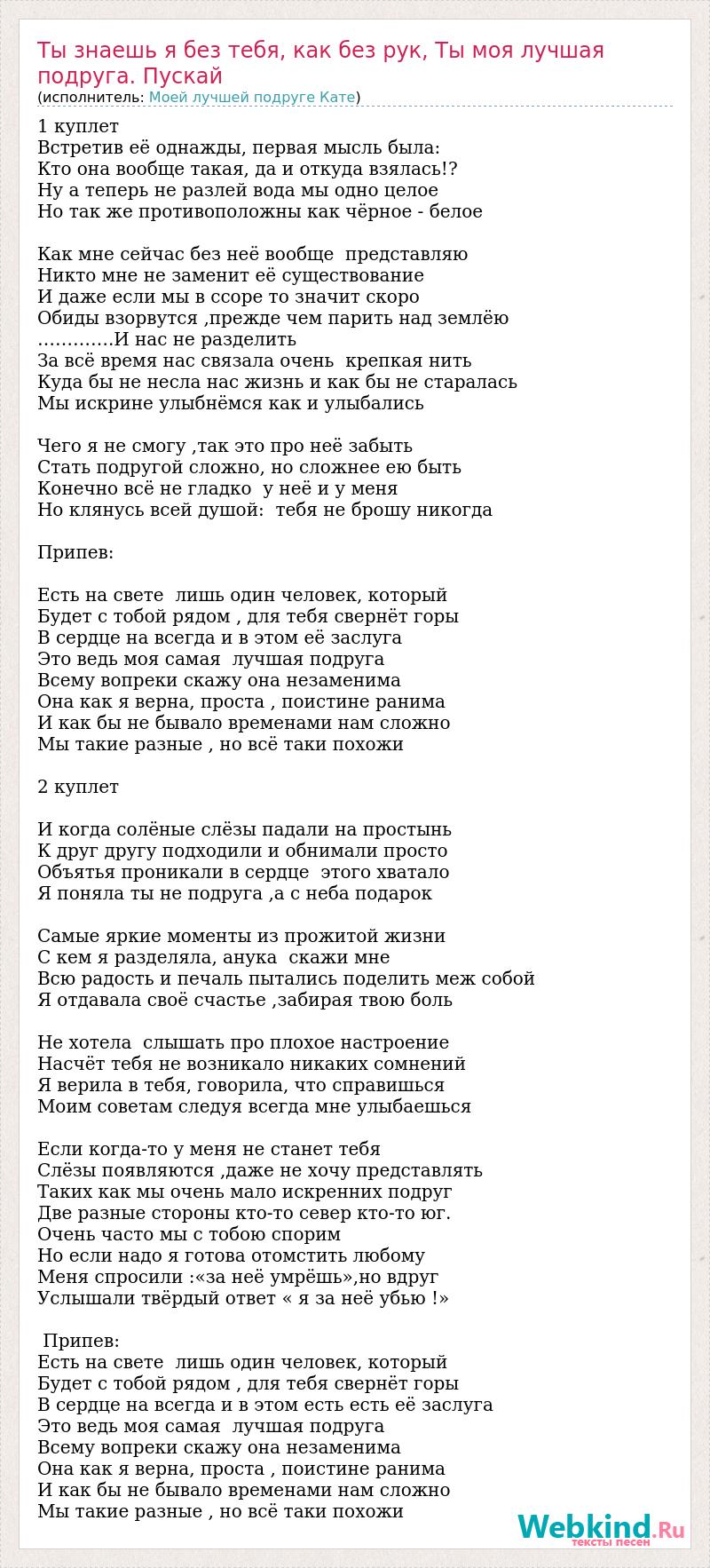 Главная→Исполнители→Моей лучшей подруге Кате→Ты знаешь я без тебя, как без рук, Ты моя лучшая подруга. Пускай