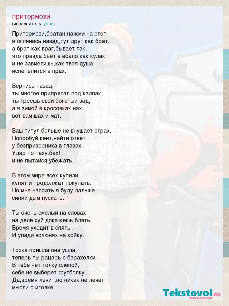 Притормози,братан,нажми на стоп и оглянись назад,тут друг как брат, а брат как враг,бывает так, что правда бьет в ебало как кулак и не завметишь,как твоя душа испепелится в прах. Вернись назад, ты многое припрятал под калпак, ты греешь свой богатый зад, а я зимой в кросовках нах, вот вам шах и мат. Ваш титул больше не внушает страх. Попробуй,кент,найти ответ у безпризорника в глазах. Удар по паху.бах! и не пытайся убежать. В этом мире всех купили, купят и продолжат покупать. Но мне насрать,я буду дальше синий дым пускать. Ты очень смелый на словах на деле хуй докажешь,блять. Время уходит в спять . И упади вслюнях на койку. Тоска пришла,она ушла, теперь ты рацарь с барахолки. В тебе нет толку,слепой, себе не выберет футболку. Да,время лечит,но никак не лечат мысли о иголке.