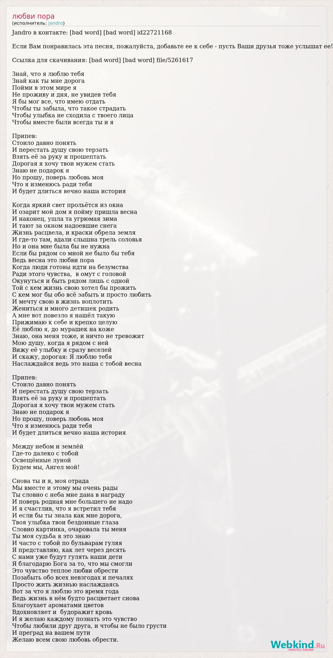 Jandro в контакте: [bad word] [bad word] id22721168 Если Вам понравилась эта песня, пожалуйста, добавьте ее к себе - пусть Ваши друзья тоже услышат ее! Ссылка для скачивания: [bad word] [bad word] file/5261617 Знай, что я люблю тебя Знай как ты мне дорога Пойми в этом мире я Не проживу и дня, не увидев тебя Я бы мог все, что имею отдать Чтобы ты забыла, что такое страдать Чтобы улыбка не сходила с твоего лица Чтобы вместе были всегда ты и я Припев: Стоило давно понять И перестать душу свою терзать Взять её за руку и прошептать Дорогая я хочу твои мужем стать Знаю не подарок я Но прошу, поверь любовь моя Что я изменюсь ради тебя И будет длиться вечно наша история Когда яркий свет прольётся из окна И озарит мой дом я пойму пришла весна И наконец, ушла та угрюмая зима И тают за окном надоевшие снега Жизнь расцвела, и краски обрела земля И где-то там, вдали слышна трель соловья Но и она мне была бы не нужна Если бы рядом со мной не было бы тебя Ведь весна это любви пора Когда люди готовы идти на безумства Ради этого чувства, в омут с головой Окунуться и быть рядом лишь с одной Той с кем жизнь свою хотел бы прожить С кем мог бы обо всё забыть и просто любить И мечту свою в жизнь воплотить Жениться и много детишек родить А мне вот повезло я нашёл такую Прижимаю к себе и крепко целую Её люблю я, до мурашек на коже Знаю, она меня тоже, и ничто не тревожит Мою душу, когда я рядом с ней Вижу её улыбку и сразу веселей И скажу, дорогая: Я люблю тебя Наслаждайся ведь это наша с тобой весна Припев: Стоило давно понять И перестать душу свою терзать Взять её за руку и прошептать Дорогая я хочу твои мужем стать Знаю не подарок я Но прошу, поверь любовь моя Что я изменюсь ради тебя И будет длиться вечно наша история Между небом и землёй Где-то далеко с тобой Освещённые луной Будем мы, Ангел мой! Снова ты и я, моя отрада Мы вместе и этому мы очень рады Ты словно с неба мне дана в награду И поверь родная мне большего не надо И я счастлив, что я встретил тебя И если бы ты знала как мне дорога, Твоя улыбка твои бездонные глаза Словно картинка, очаровала ты меня Ты моя судьба я это знаю И часто с тобой по бульварам гуляя Я представляю, как лет через десять С нами уже будут гулять наши дети Я благодарю Бога за то, что мы смогли Это чувство теплое любви обрести Позабыть обо всех невзгодах и печалях Просто жить жизнью наслаждаясь Вот за что я люблю это время года Ведь жизнь в нём будто расцветает снова Благоухает ароматами цветов Вдохновляет и будоражит кровь И я желаю каждому познать это чувство Чтобы любили друг друга, и чтобы не было грусти И преград на вашем пути Желаю всем свою любовь обрести.